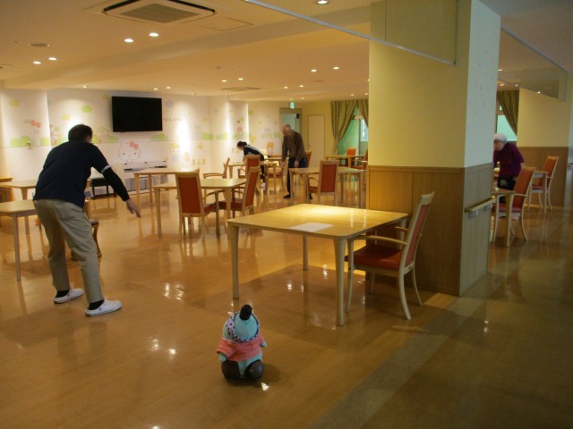 リハビリ担当が皆さんを外に連れて行ってくれています。