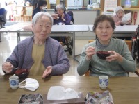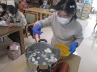こんにちは、デイサービスです。今日のレクは、おしるこ作りです。皆様、とても楽しみにしていたレクリエーションです(≧▽≦) 皆様には、白玉粉に水を入れたものを捏ねていただきました(^^♪ 大きさはビー玉位でお願いしました。その後は、お鍋で茹でていただくのも手伝っていただき、美味しそうな白玉が茹で上がりました(^^♪ おしるこを用意している間皆様には脳トレをしてお待ちしてもらい、おやつの時間になり召し上がって頂くと皆様のお顔が笑顔になり「甘くて美味し~い♡」「白玉の大きさが丁度いいねぇ~」と、とても喜んでくださいました(*^-^*)