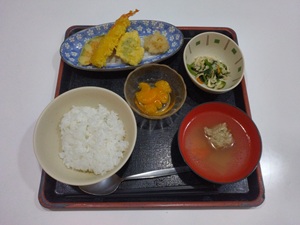 昼食のご紹介です。「ご飯」「つみれ汁」「天ぷら盛り合わせ」「菜の花の湯葉和え」「フルーツ」でした。海老天が大きいと好評でした♪