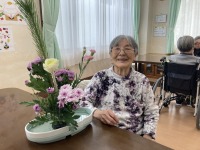 家族様がお母様にと届けてくださった生花をご本人に生けて頂きました。