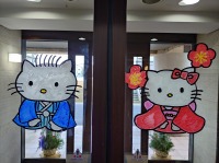 アメリカンフラワーで作成された飾りに、正面玄関に描かれたキティちゃんとダニエルくんです。