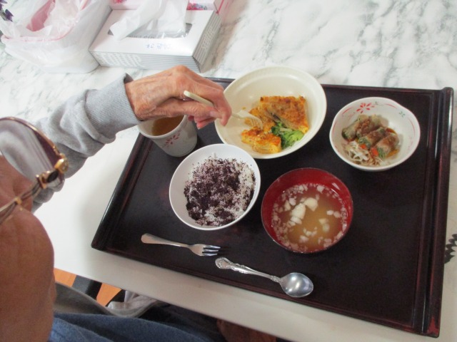 夕方、フロアで夕食を待っておられるご利用者様( ^^) _旦~~お茶をお出ししゆっくりされていました。本日のメインメニューは【五目玉子焼き】と【肉巻き】‼とってもおいしそうでした(*^-^*)お箸がすすみ、しっかり完食されていました(*^▽^*)
