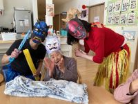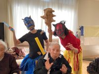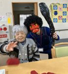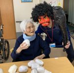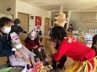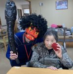 グループホームではご入居者様と豆まきをしました。スタッフが扮した赤鬼青鬼に「鬼は~外」と皆様豆を次から次へと投げられていました。