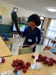リビングの壁には、利用者様のお手伝いにより一足早く梅の花が咲き誇り、季節は一足早く春を迎えています。昼食には恵方巻を、<南南東>に向いて食べて頂きました。午後は赤鬼👹・青鬼に扮した男性スタッフに鬼は外・・福は内と威勢よく大きな豆を投げつけられていました・・・(^_-)-☆