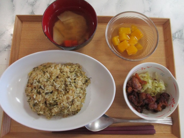 *高菜チャーハン *阿蘇から揚げ *だご汁風 *フルーツ