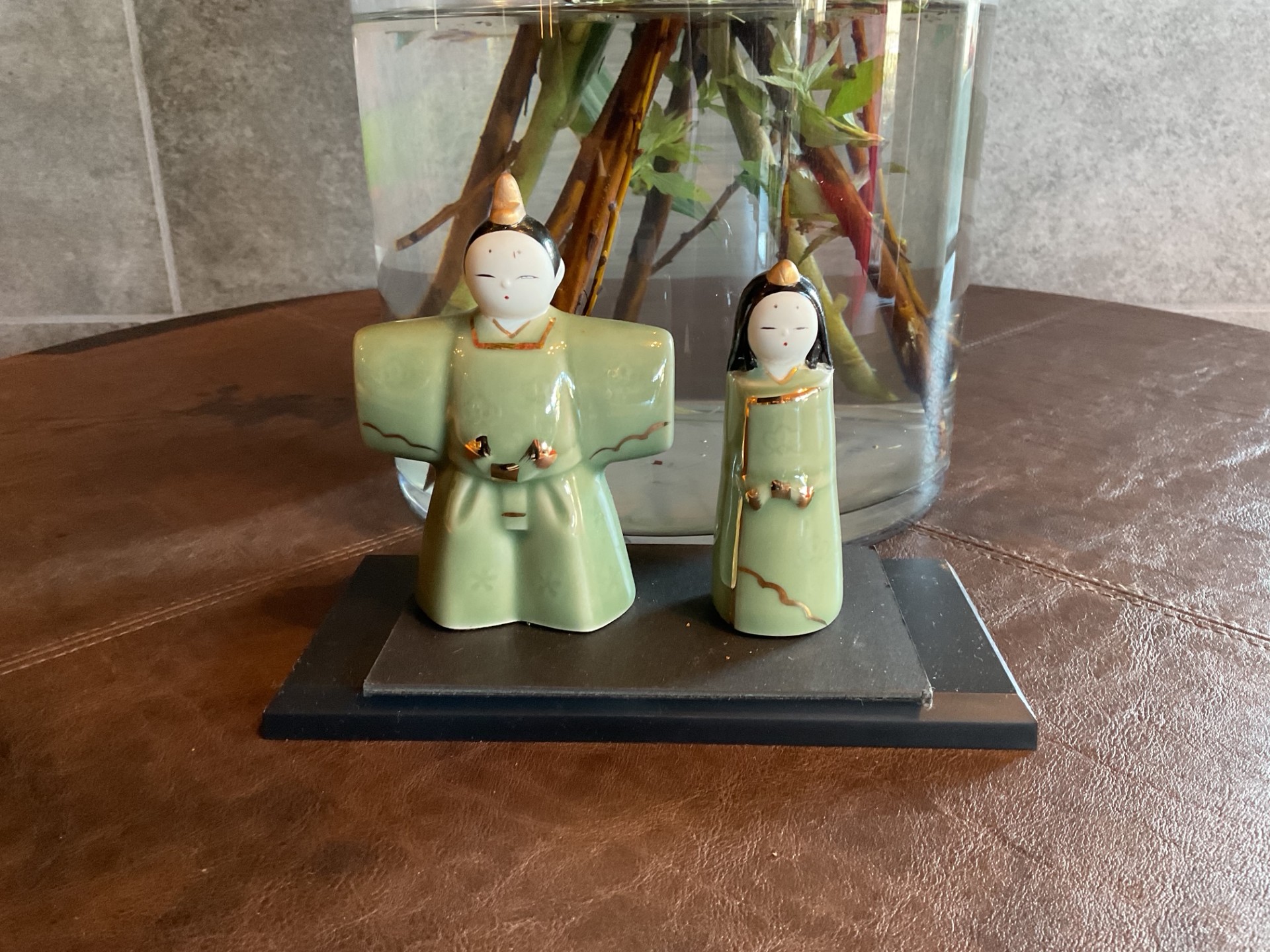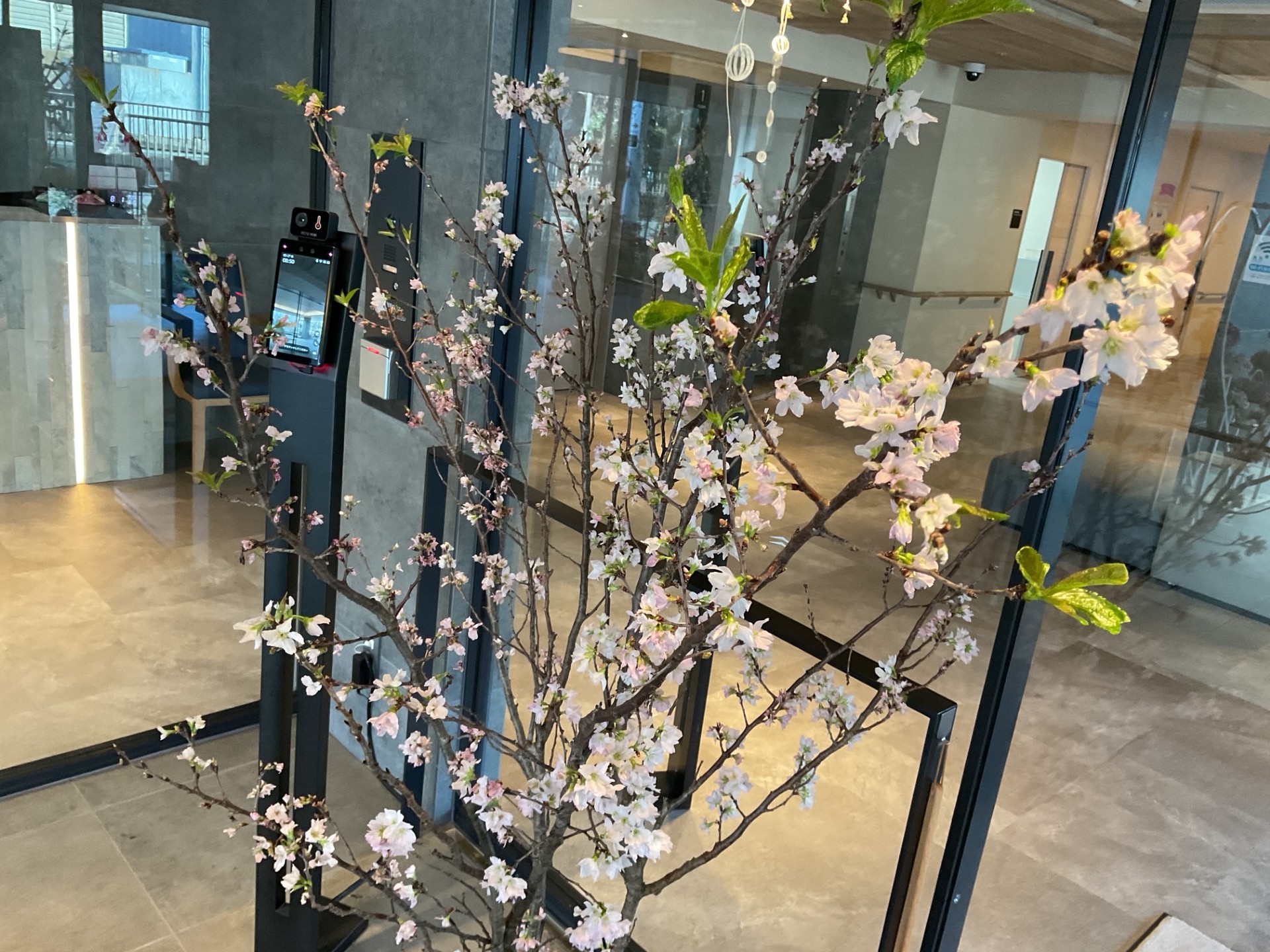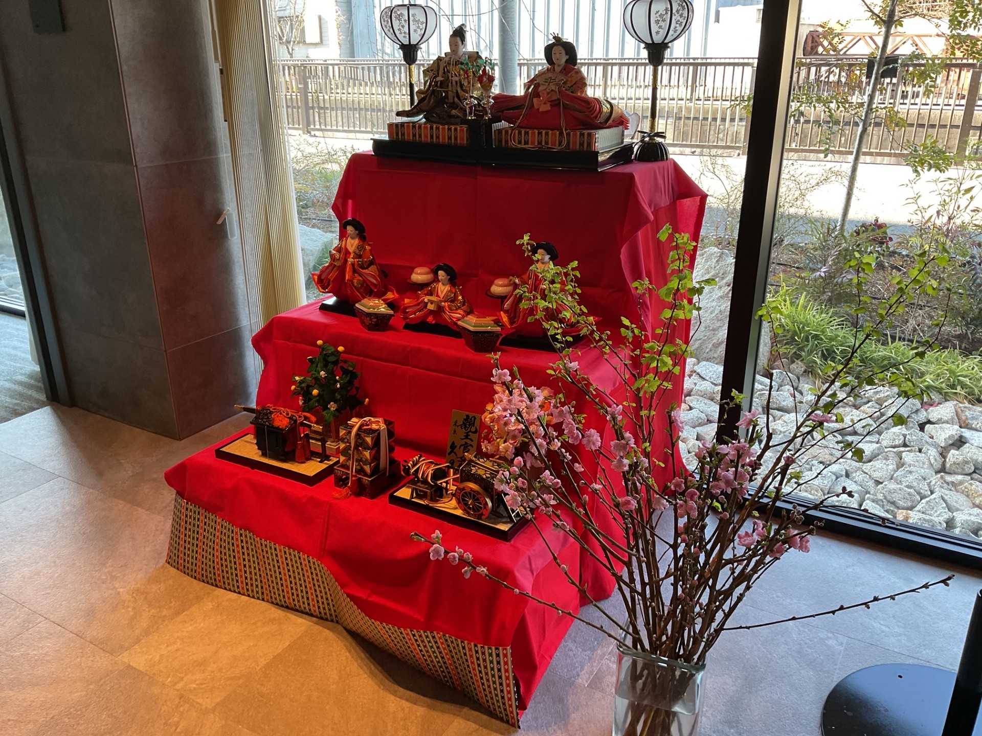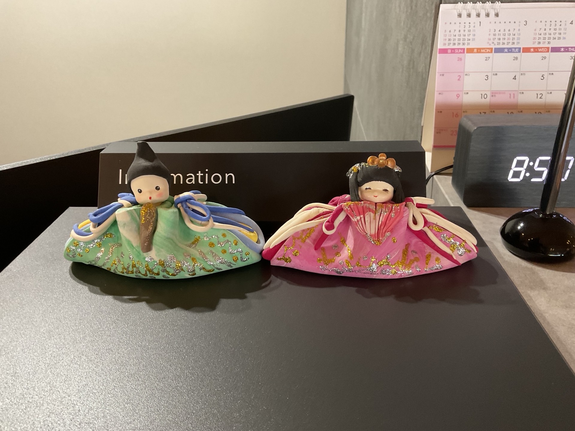 エントランス風除室には桜の花🌸、受付フロントには愛らしいお雛様とお内裏様の置物などなど…。
