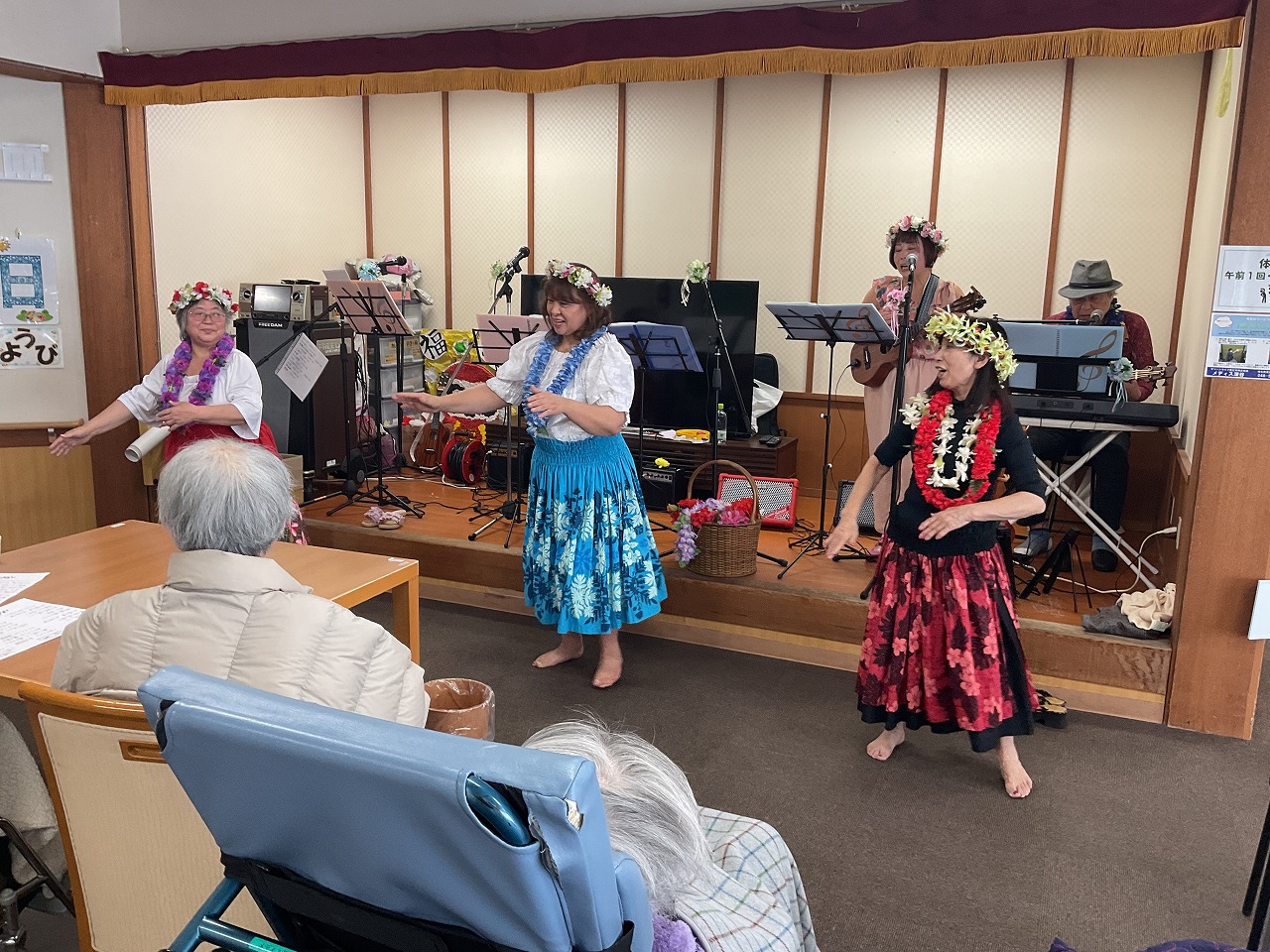 歩行可能な入居者様は飛び入りで一緒にフラダンスを踊りました。