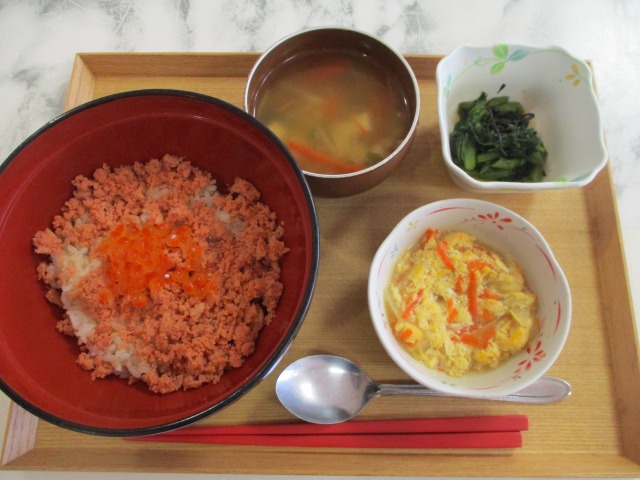 *はらこめし *卵とじ *春菊の塩昆布和え *おくずかけ風