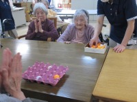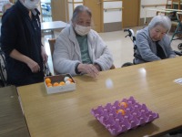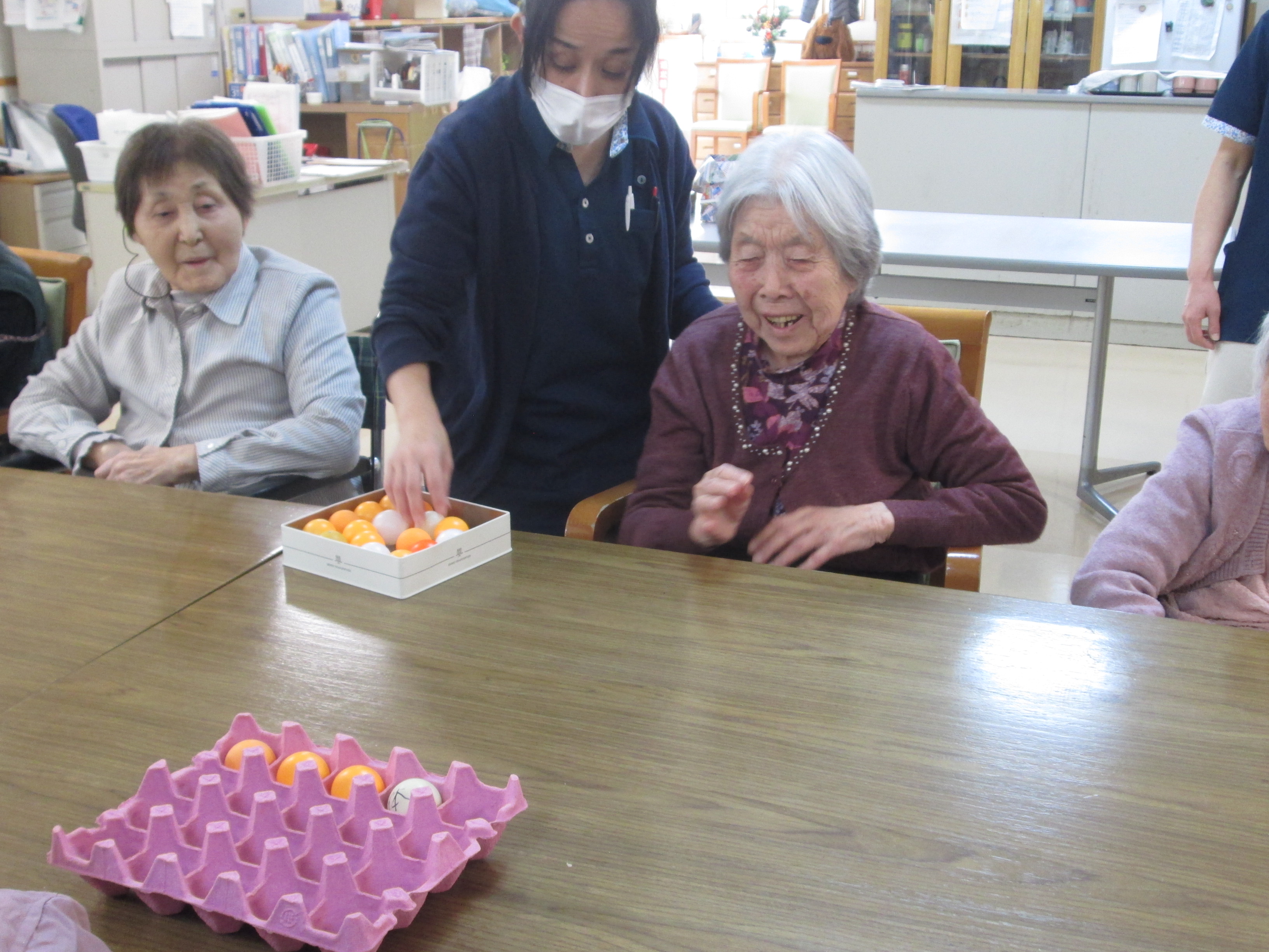 こんにちはデイサービスです。今日は今年最後のレクリエーションでピンポン玉ゲームをしました。ピンポン玉を卵のトレーの中に入れて得点を競うゲームで、皆様にはピンポン玉20個投げてもらいました。皆様から「難しいね~」「真っ直ぐピンポン玉がいかないね、へそが曲がってるんだね笑」などのお声が聞こえてきましたが、デイルーム内は皆様の笑い声が響いていました(≧▽≦) 今年最後のレクは、笑顔で終わることが出来ましたので良かったです(*^^)v 今年一年ご利用いただきありがとうございました。来年もよろしくお願いいたします。皆様、良いお年をお迎えください(*^-^*)