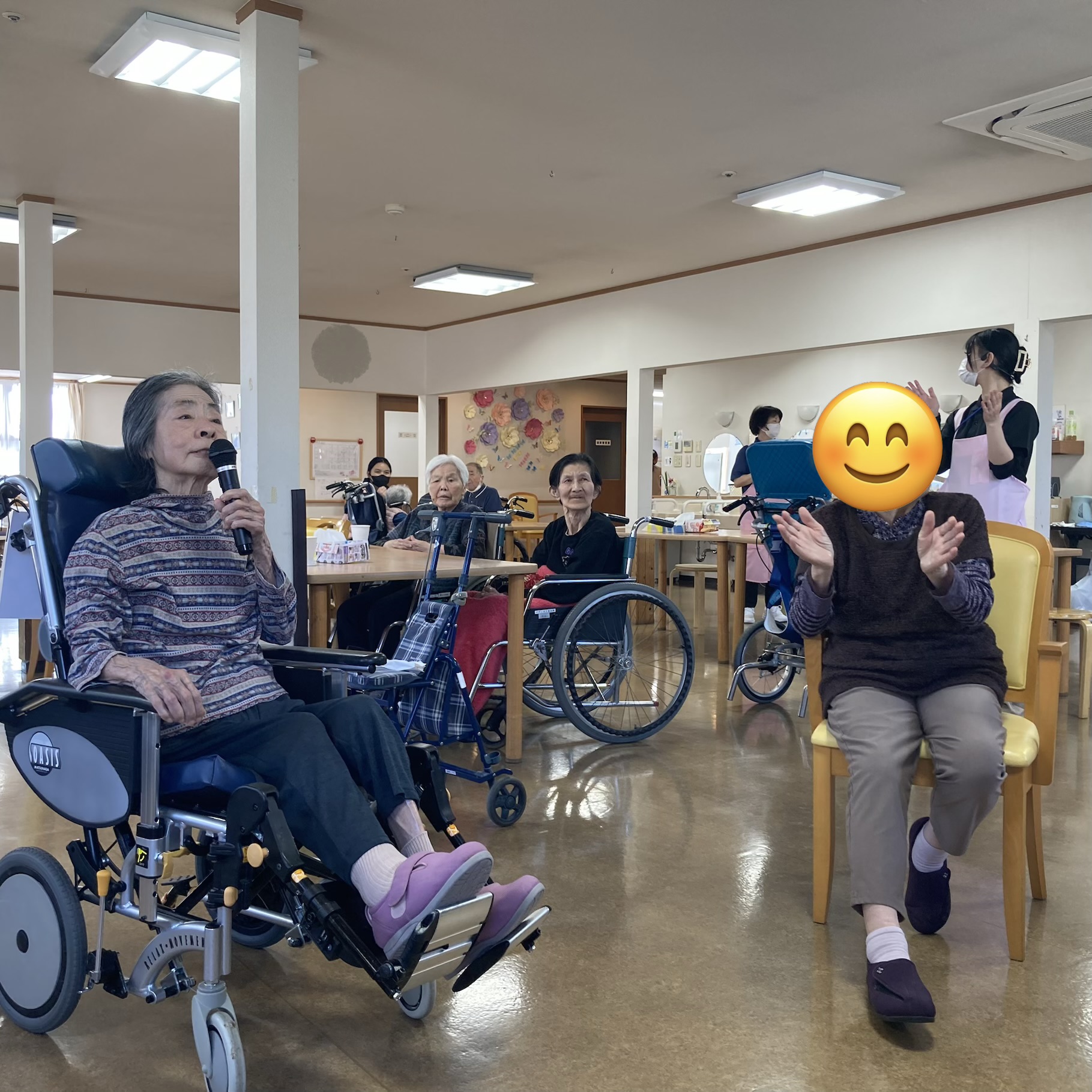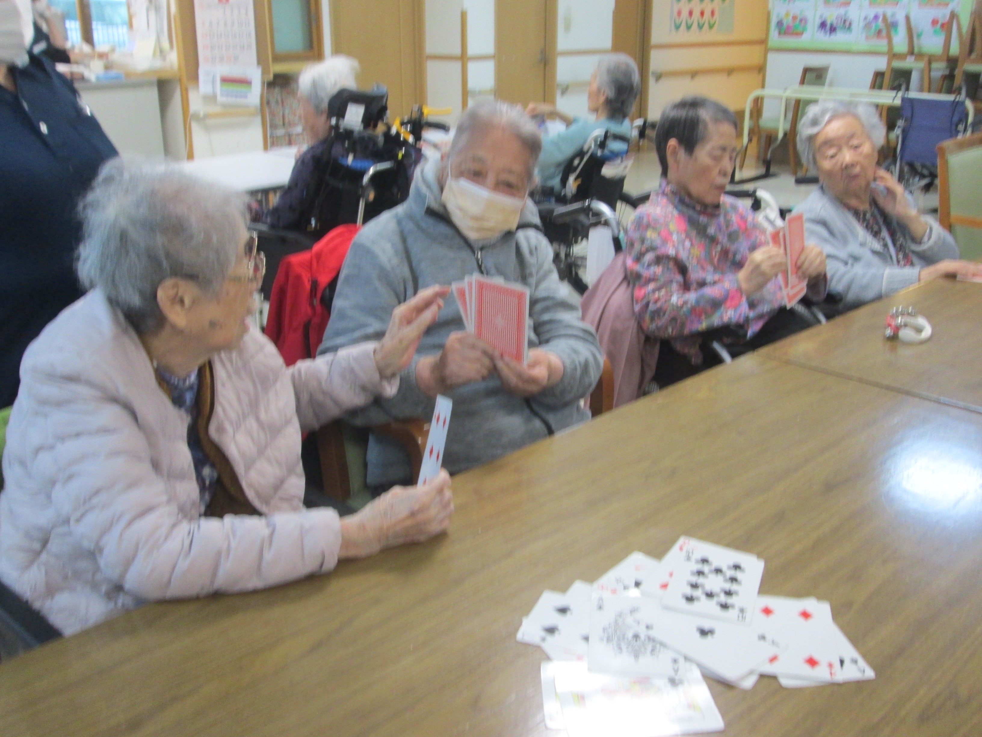 「連れてきてくれてありがとう」と大変喜ばれておりました。また、桜見学に行かれなかった方達もカードゲームで大変盛り上がっておりました。カルタやババ抜き(トランプ)を行い楽しそうな様子が見られました。特にババ抜きはみなさま大興奮されワイワイとにぎやかな一時間となりました(^^♪
