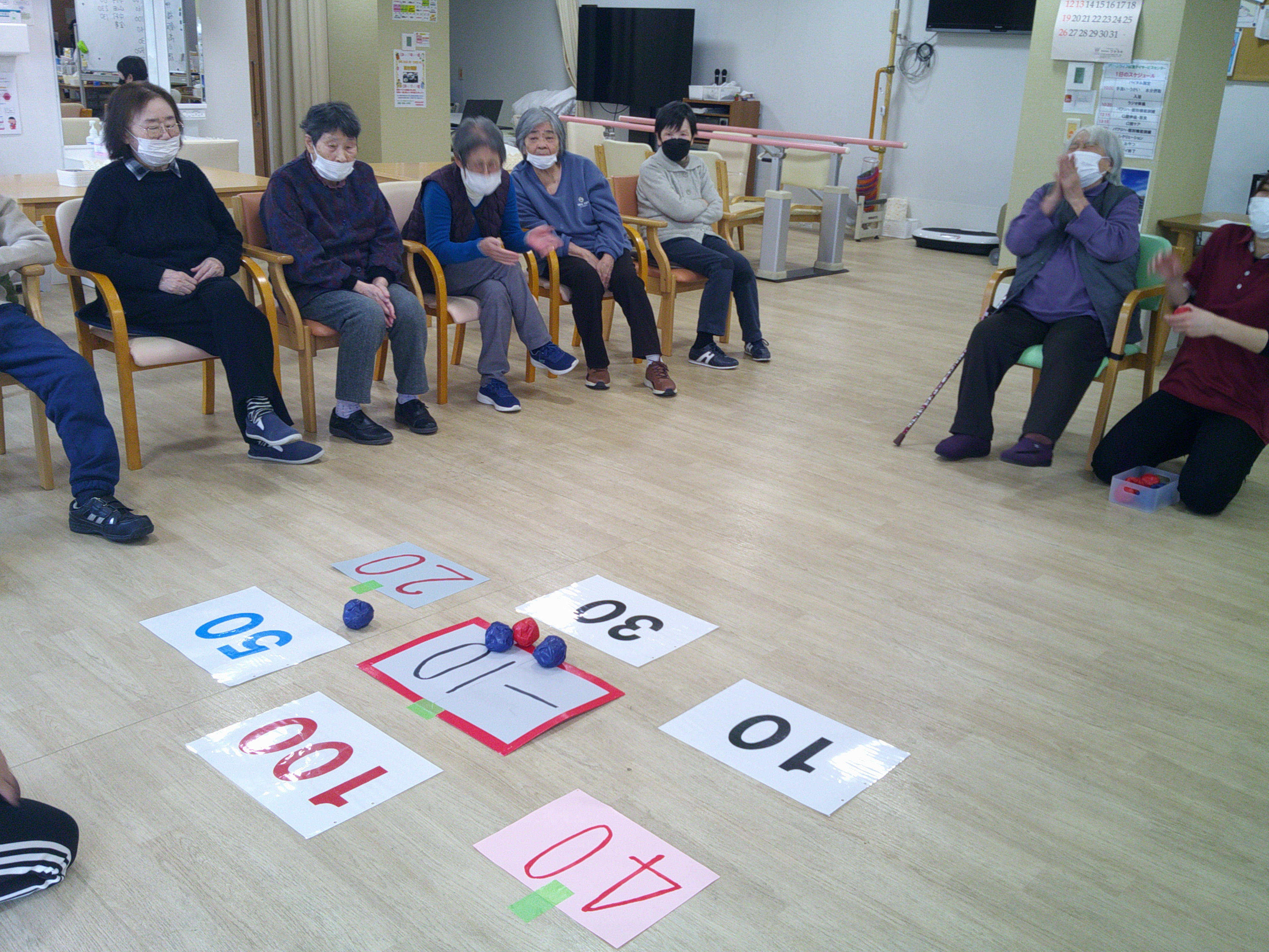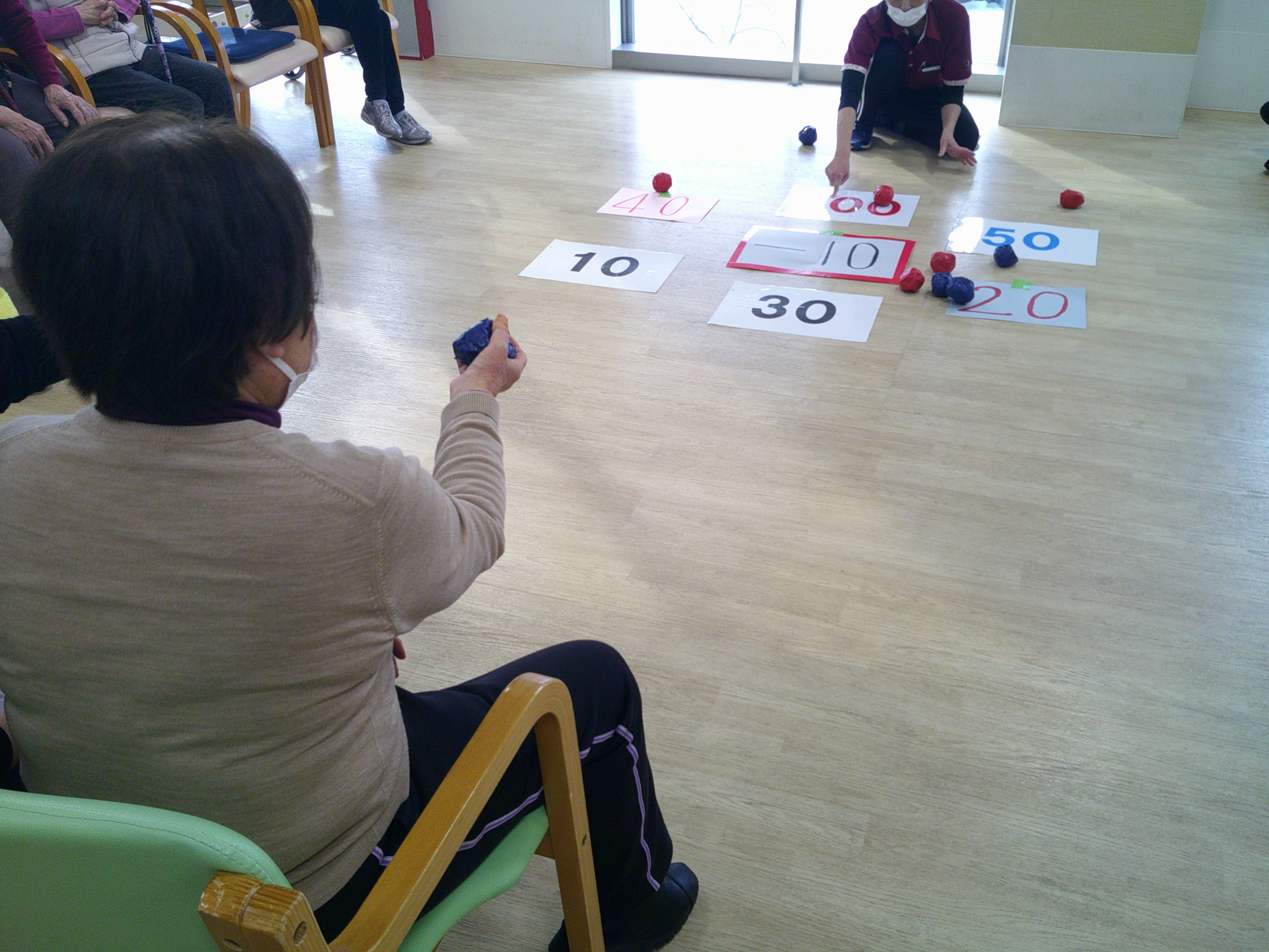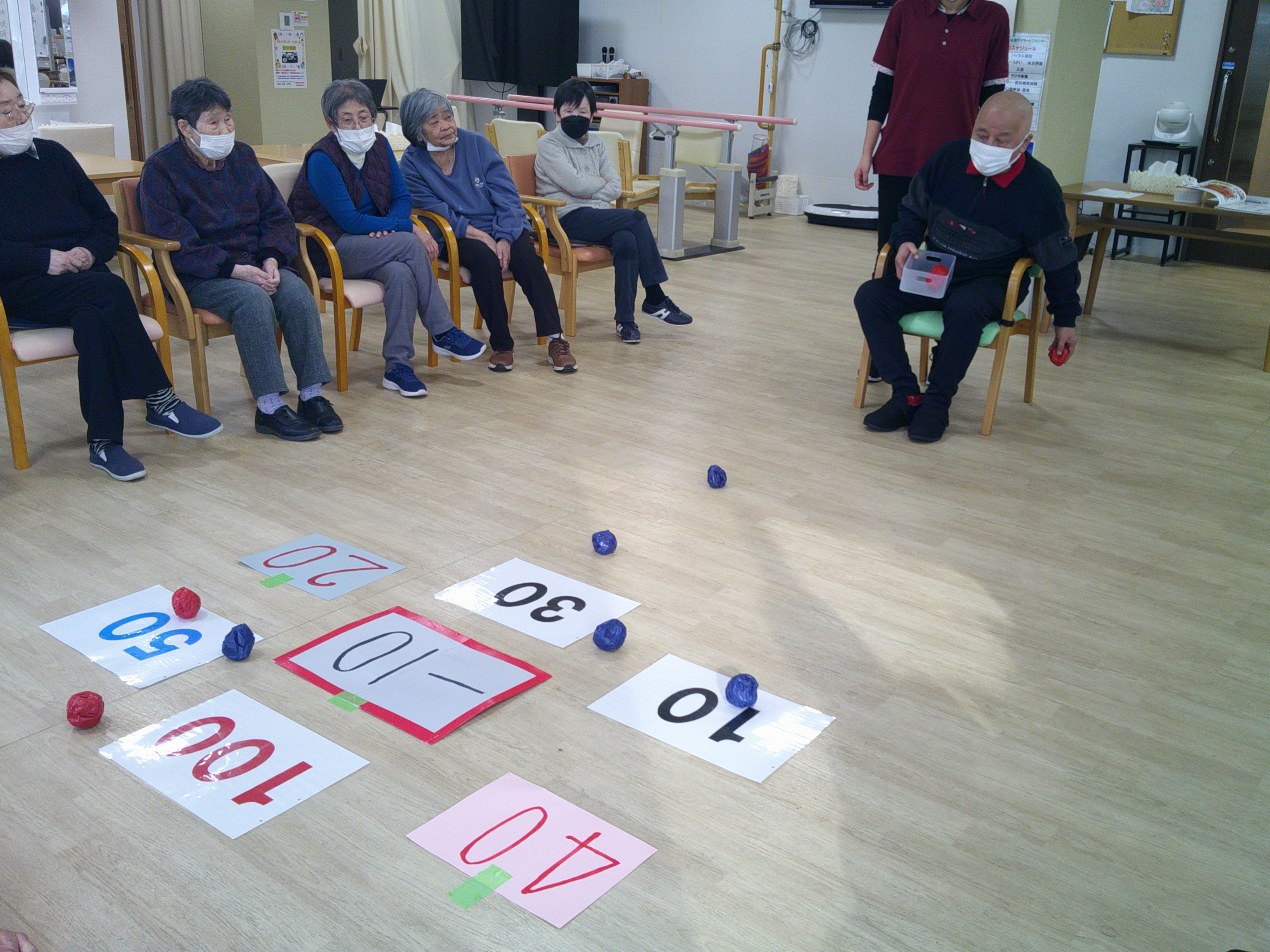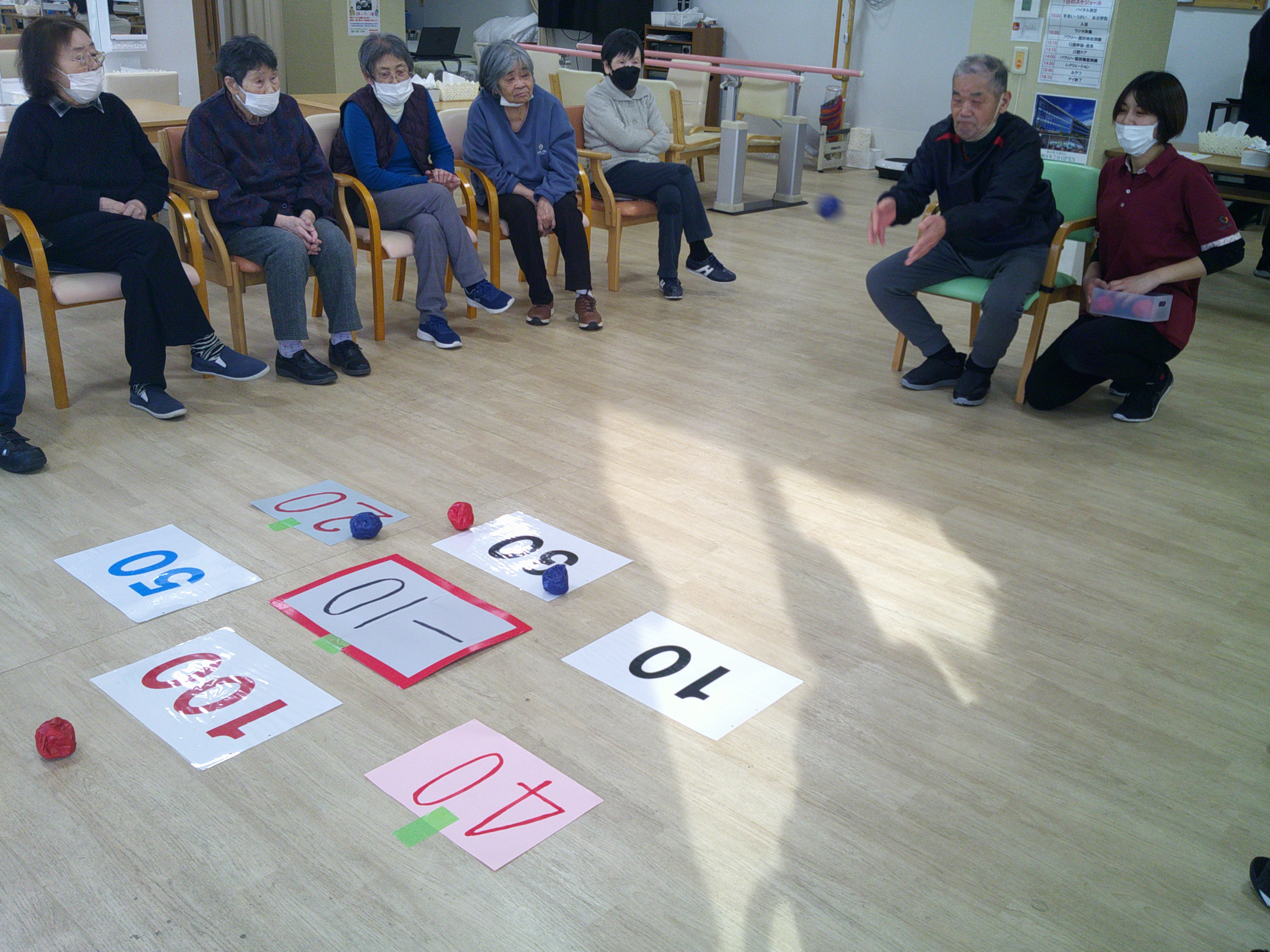 ご利用者様に混ざり職員も一緒に玉入れや風船バレーなどを共に楽しみました。