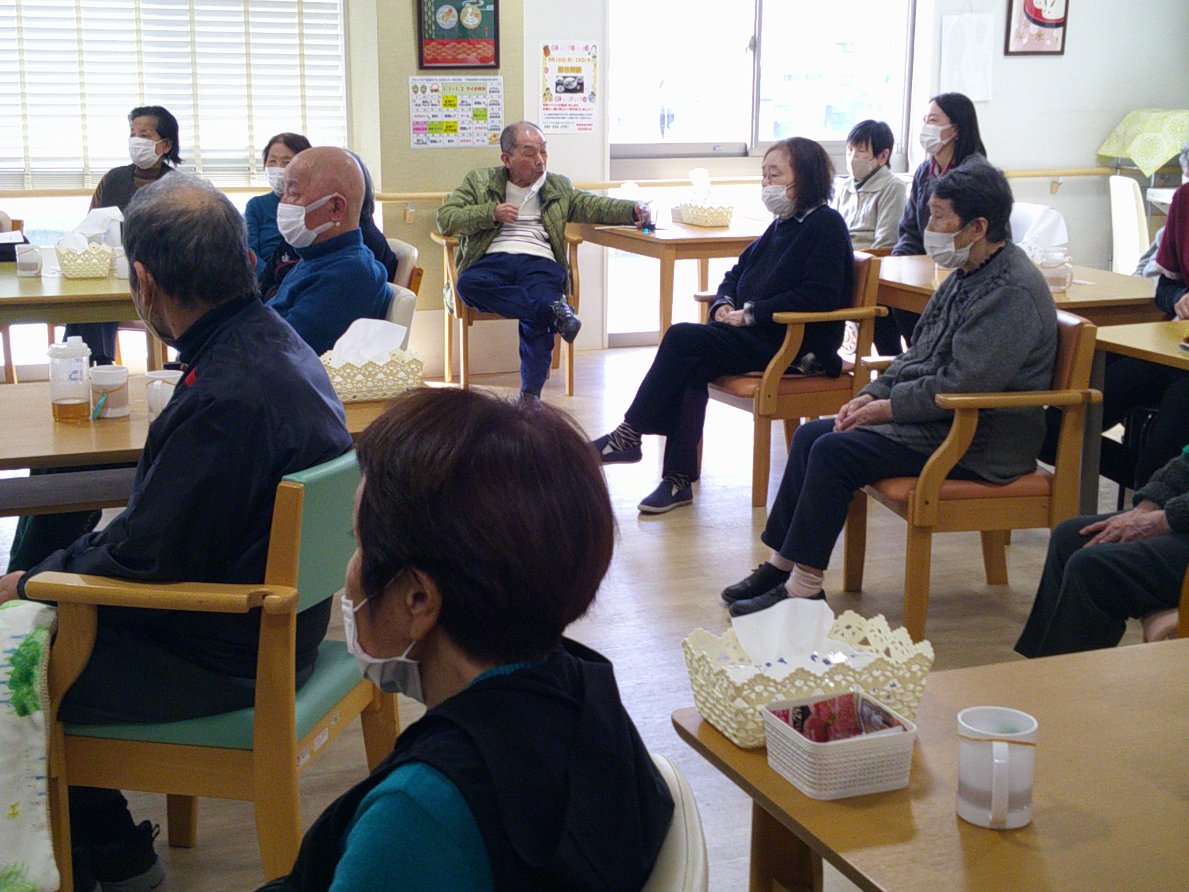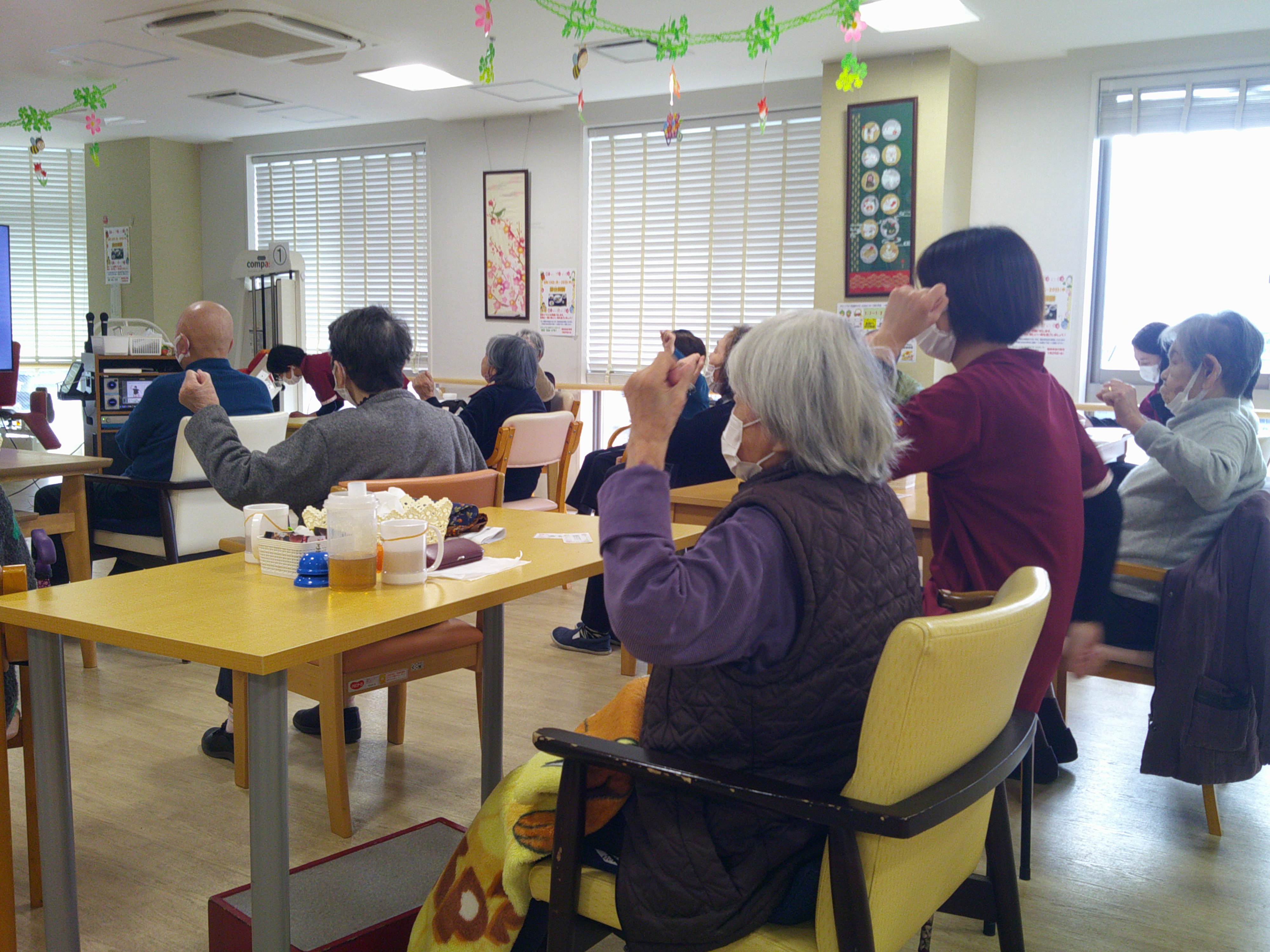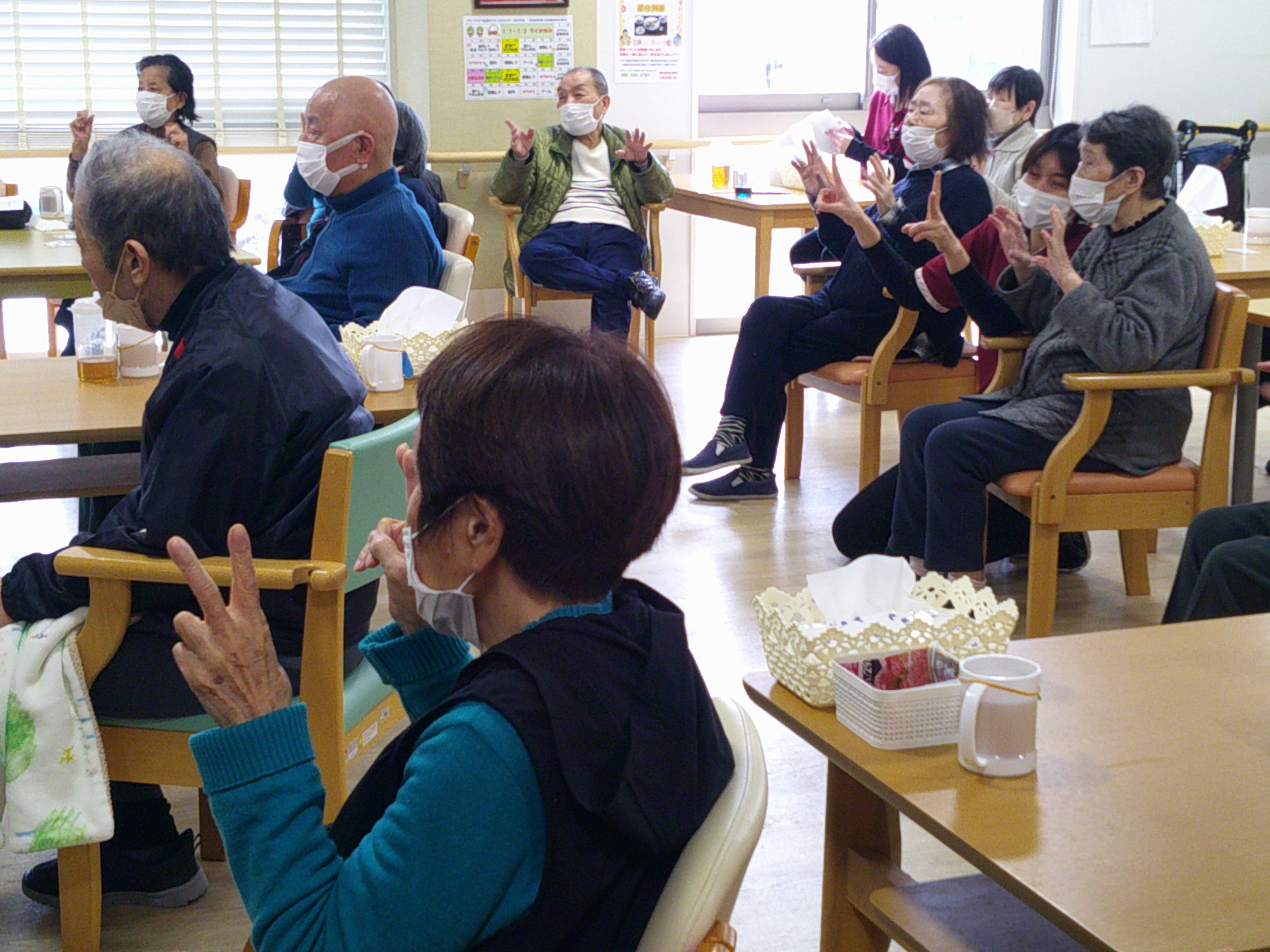 今日の午後は慰問演奏会で「元ちゃんライブ」が行われました。前回利用者様とスタッフがダンスをしたので今回は「踊れる曲を選んで来ましたよ」と言われ「真っ赤な太陽」から始まりました。皆さん初めは「私はいいわよ」「まだいいよ」と言われていましたが2曲3曲と進むにつれてスタッフのお誘いも受けて下さり何人もの方がダンスを始めました。曲の間にはじゃんけんをして絵はがきや可愛らしいシールを皆さんにプレゼントされていました。アンコールの「また逢う日まで」は皆さんで合唱して盛り上がりました。また次回も楽しみにしています(^_-)-☆
