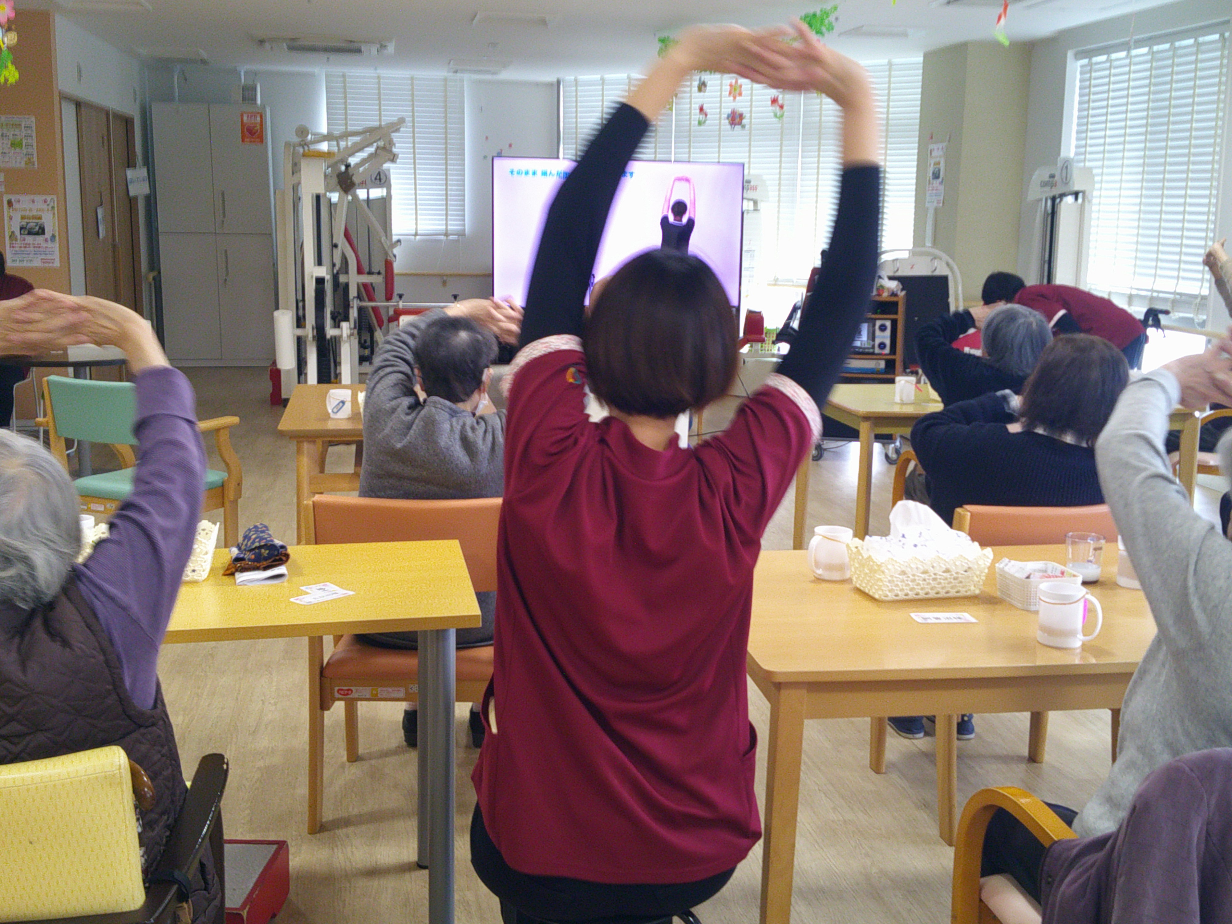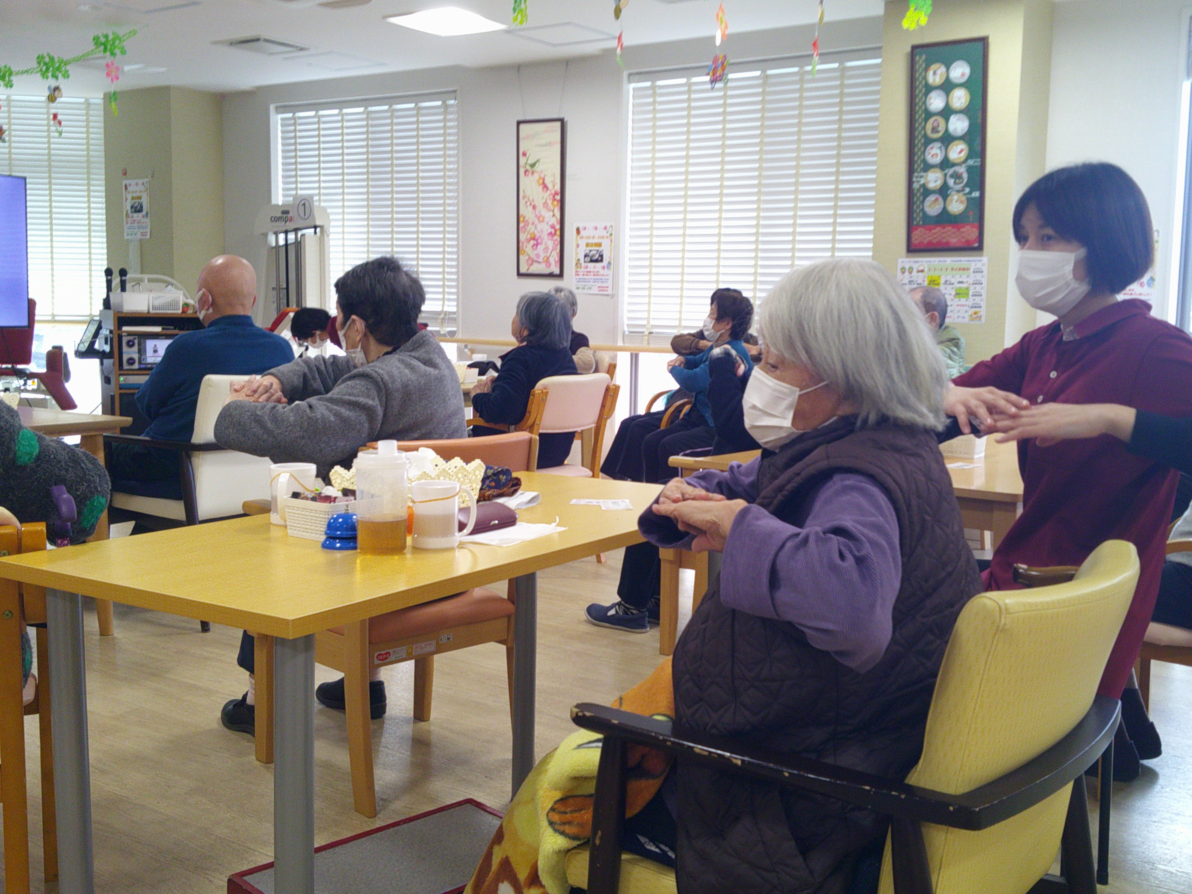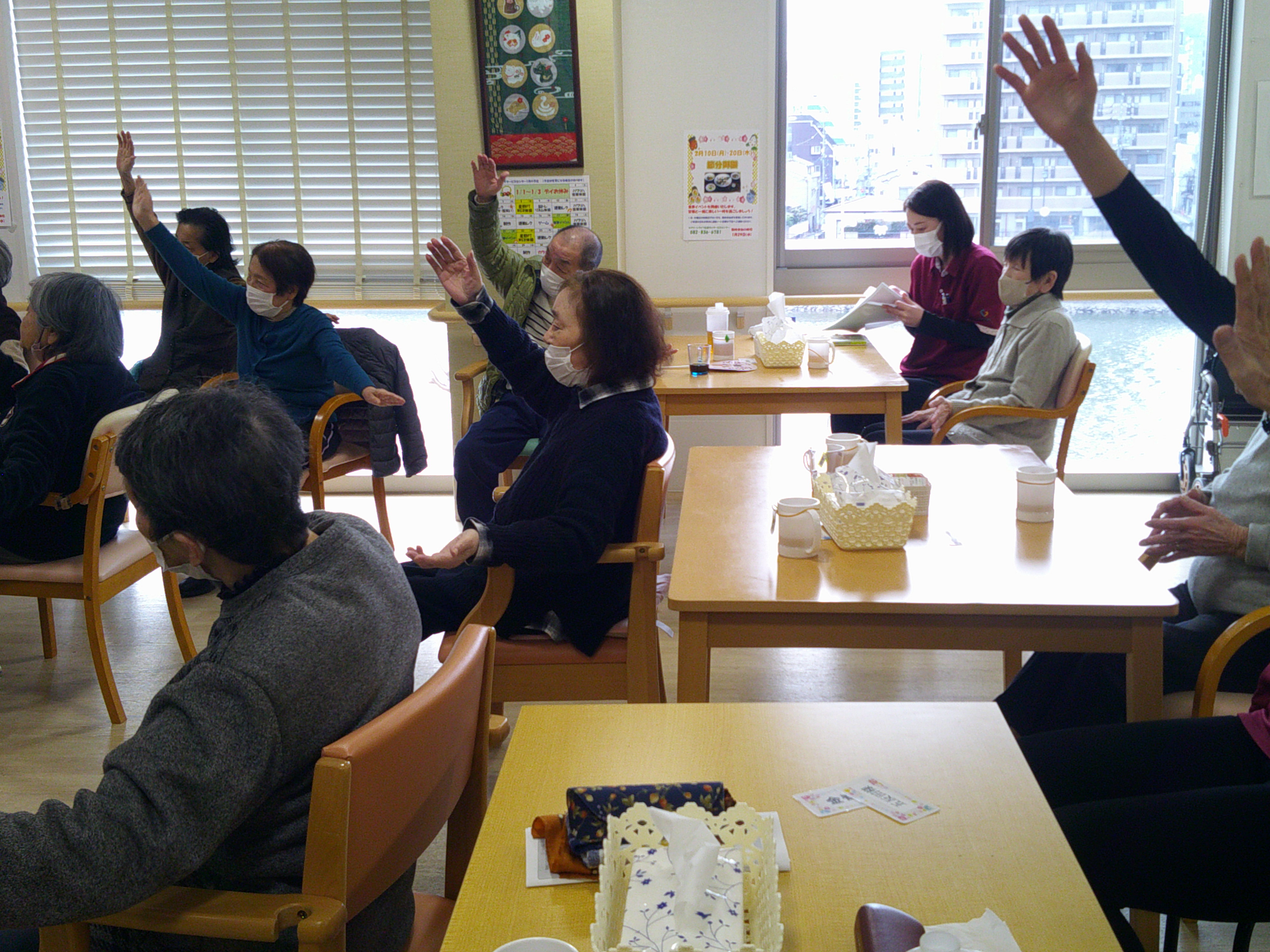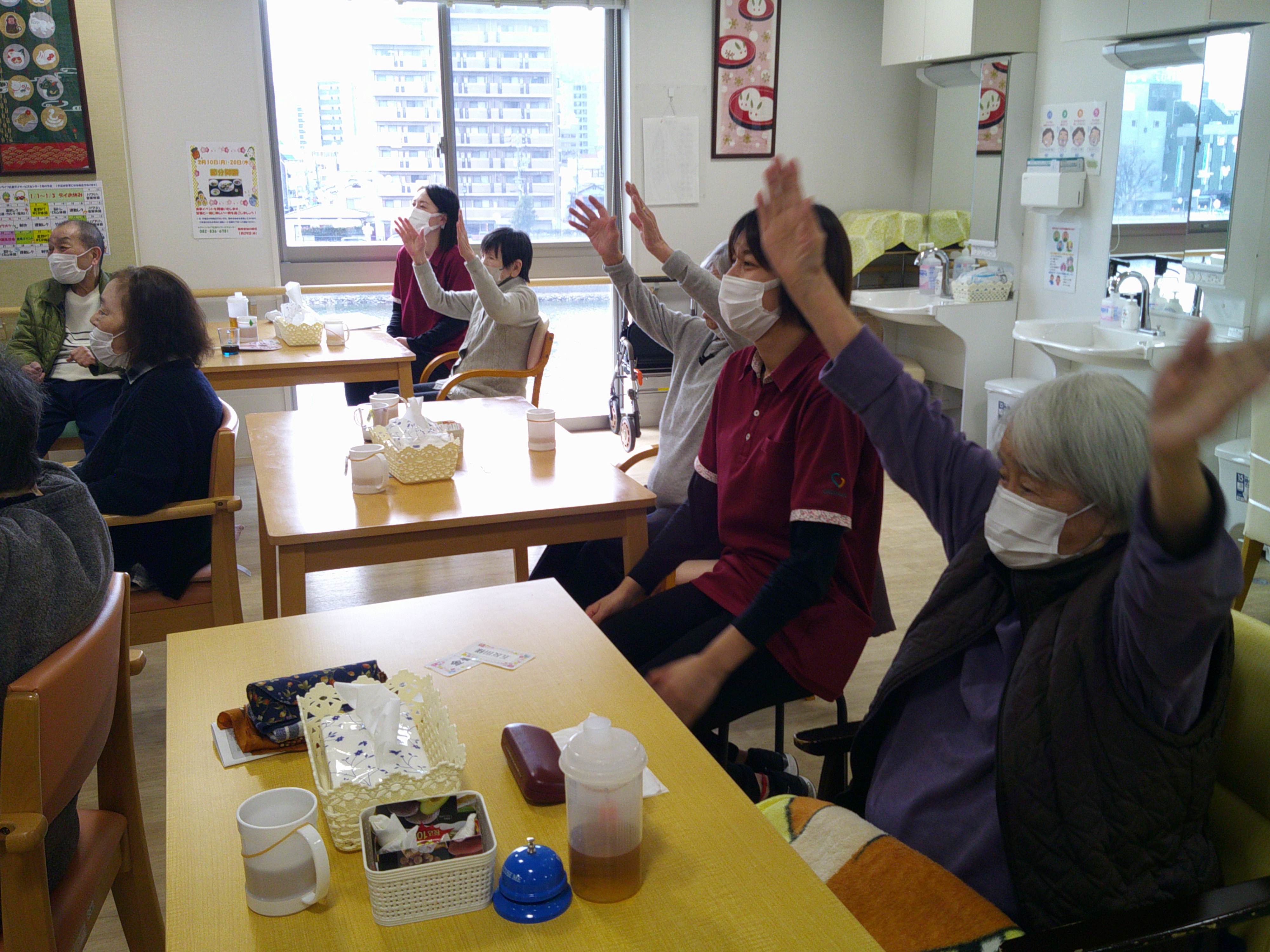 今日の午後は慰問演奏会で「元ちゃんライブ」が行われました。前回利用者様とスタッフがダンスをしたので今回は「踊れる曲を選んで来ましたよ」と言われ「真っ赤な太陽」から始まりました。皆さん初めは「私はいいわよ」「まだいいよ」と言われていましたが2曲3曲と進むにつれてスタッフのお誘いも受けて下さり何人もの方がダンスを始めました。曲の間にはじゃんけんをして絵はがきや可愛らしいシールを皆さんにプレゼントされていました。アンコールの「また逢う日まで」は皆さんで合唱して盛り上がりました。また次回も楽しみにしています(^_-)-☆