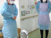 新型コロナウイルスが5類になる以前にも何度も実践していましたが、改めて着脱方法をスタッフがお互いにチェックし、適切に行えているか確認しました。