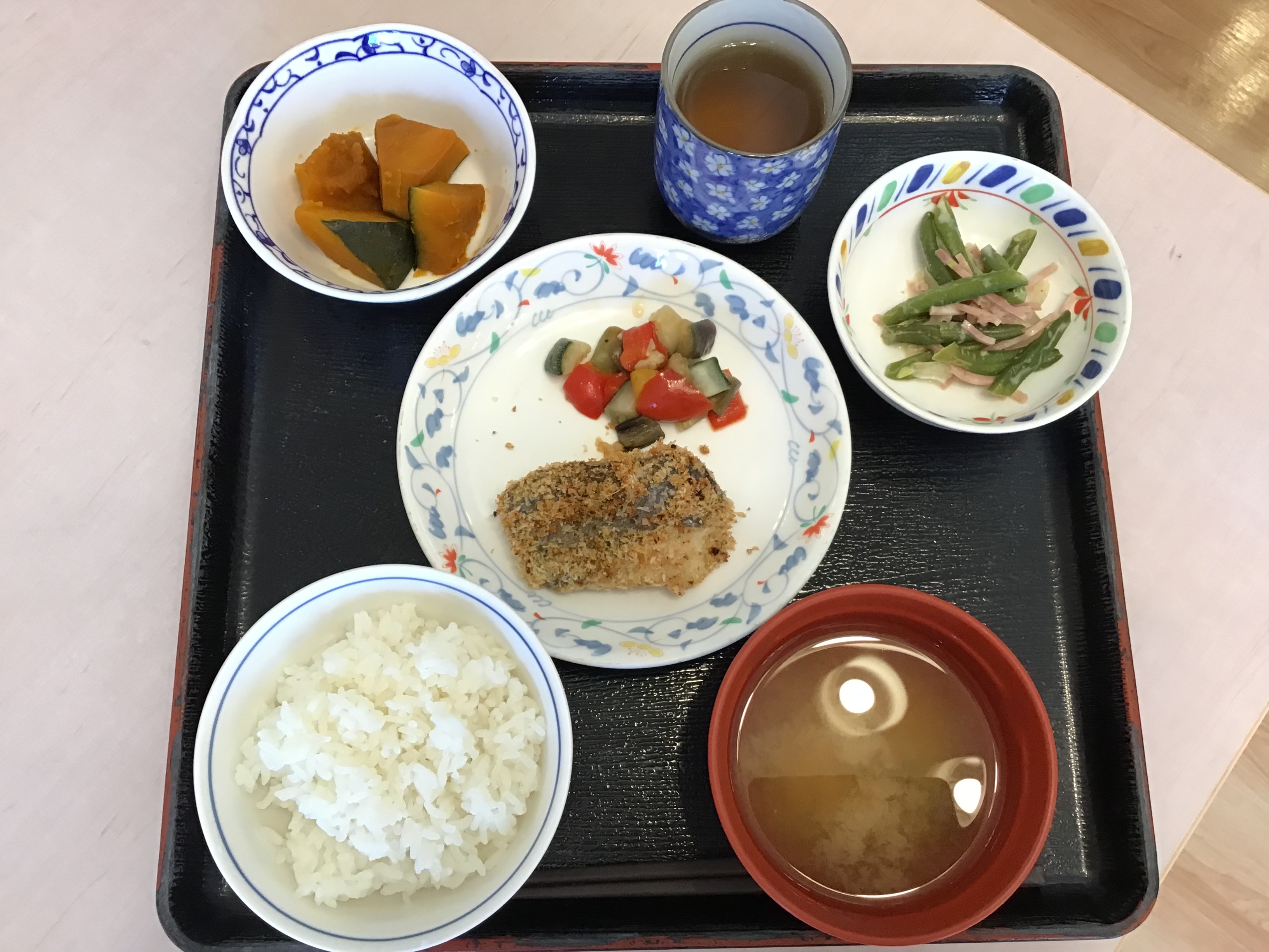 献立のメニューは、白身魚の香草焼きと南瓜の甘煮、いんげんの胡麻ドレ和えです。