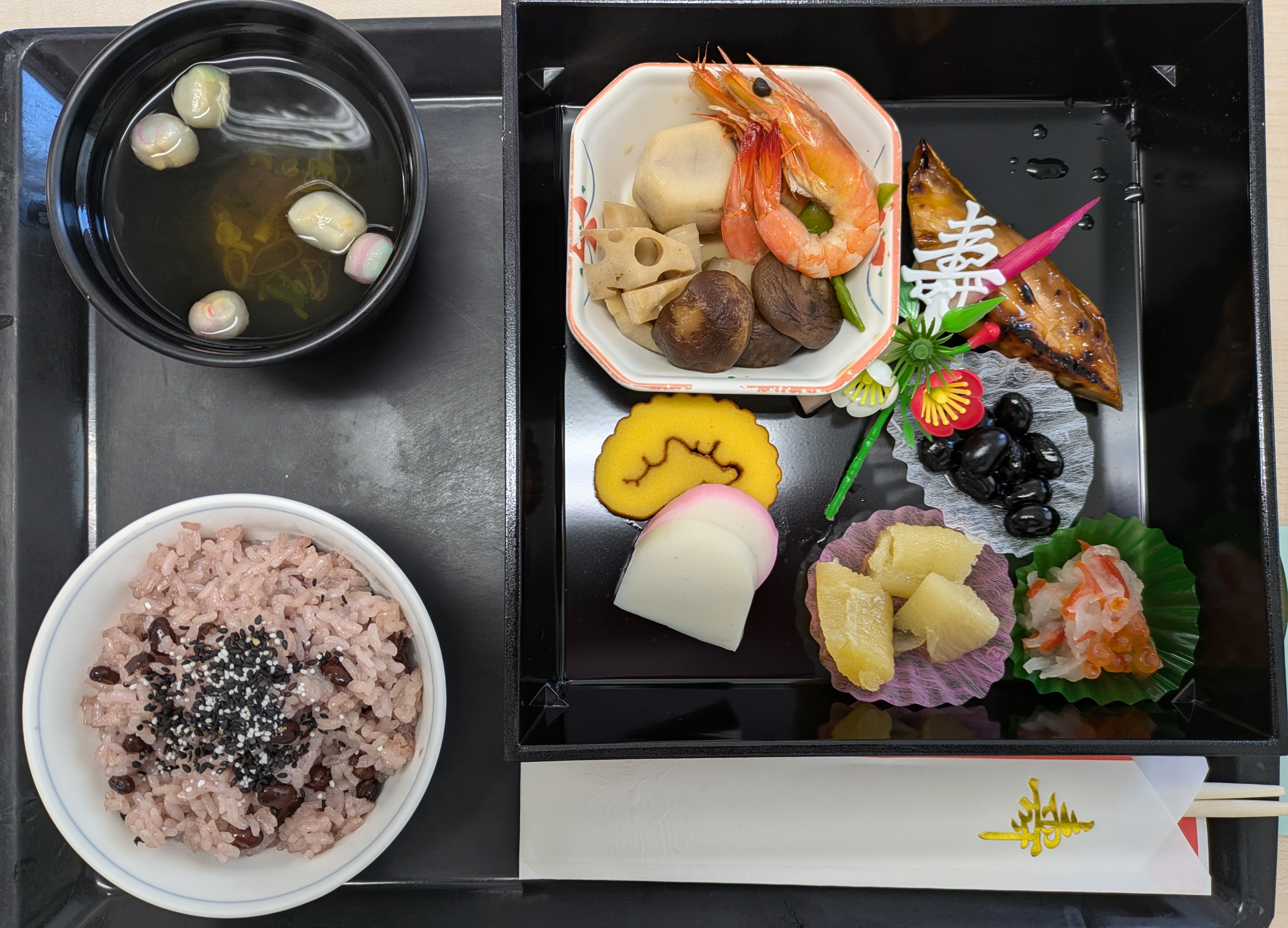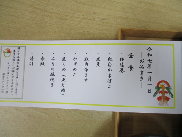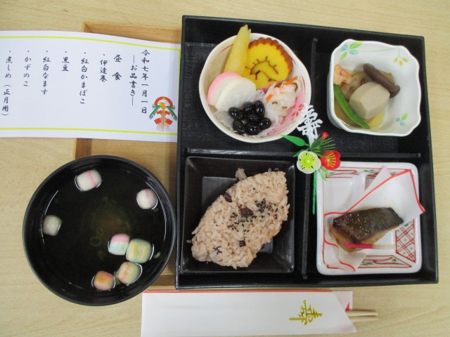 みなさんこんにちは、介護付き有料老人ホーム グリ-ンライフ中央前橋です。本日は元旦ですね!グリンライフ中央前橋ではお昼ご飯に写真のような「おせち料理」を提供致しました。海老・黒豆・ぶり・栗きんとん等々、おせち料理の定番に入居者様は大変喜んでおられました。