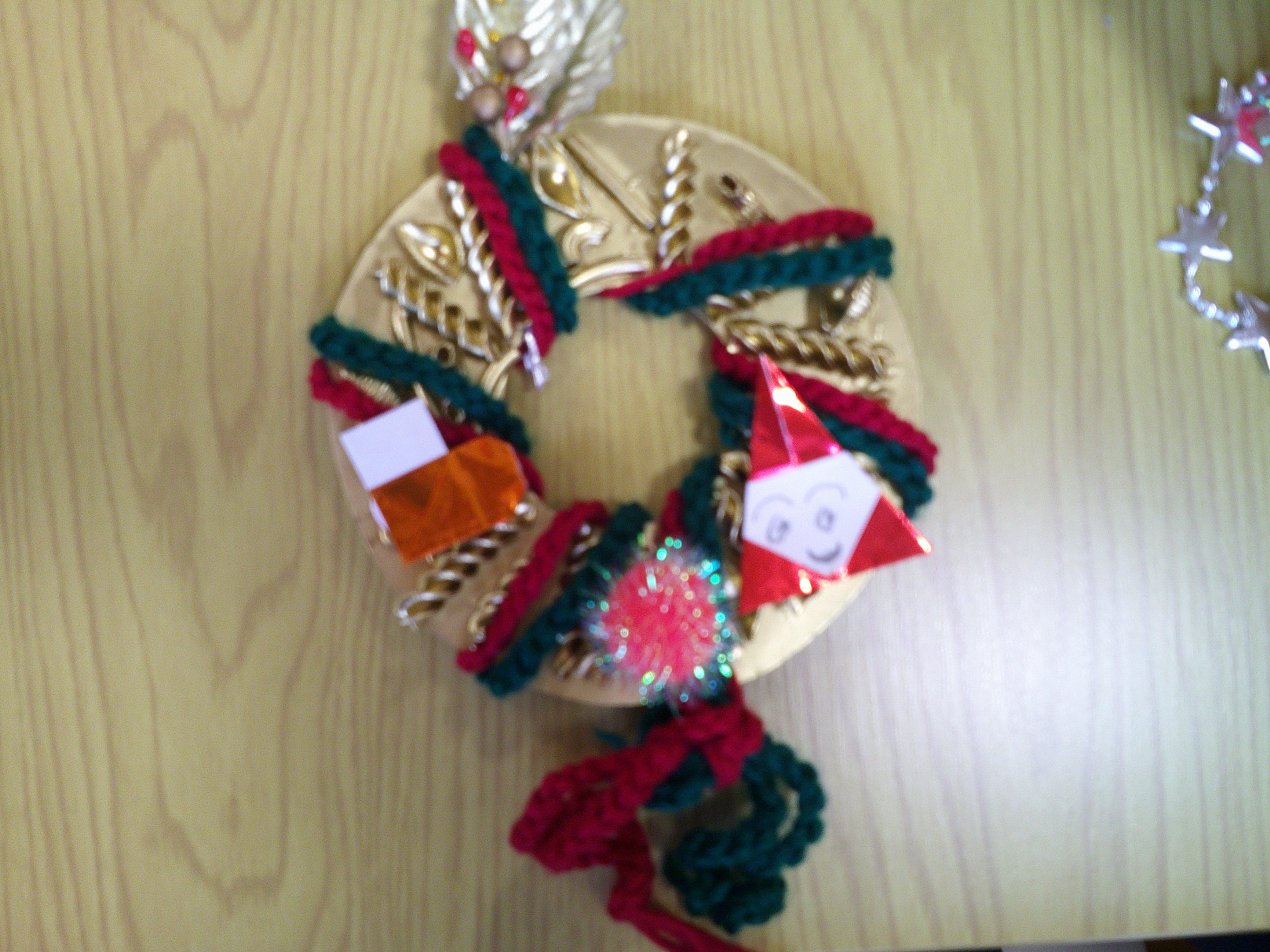 写真に上がっているのは職員がある材料から手作りしたリースになります。