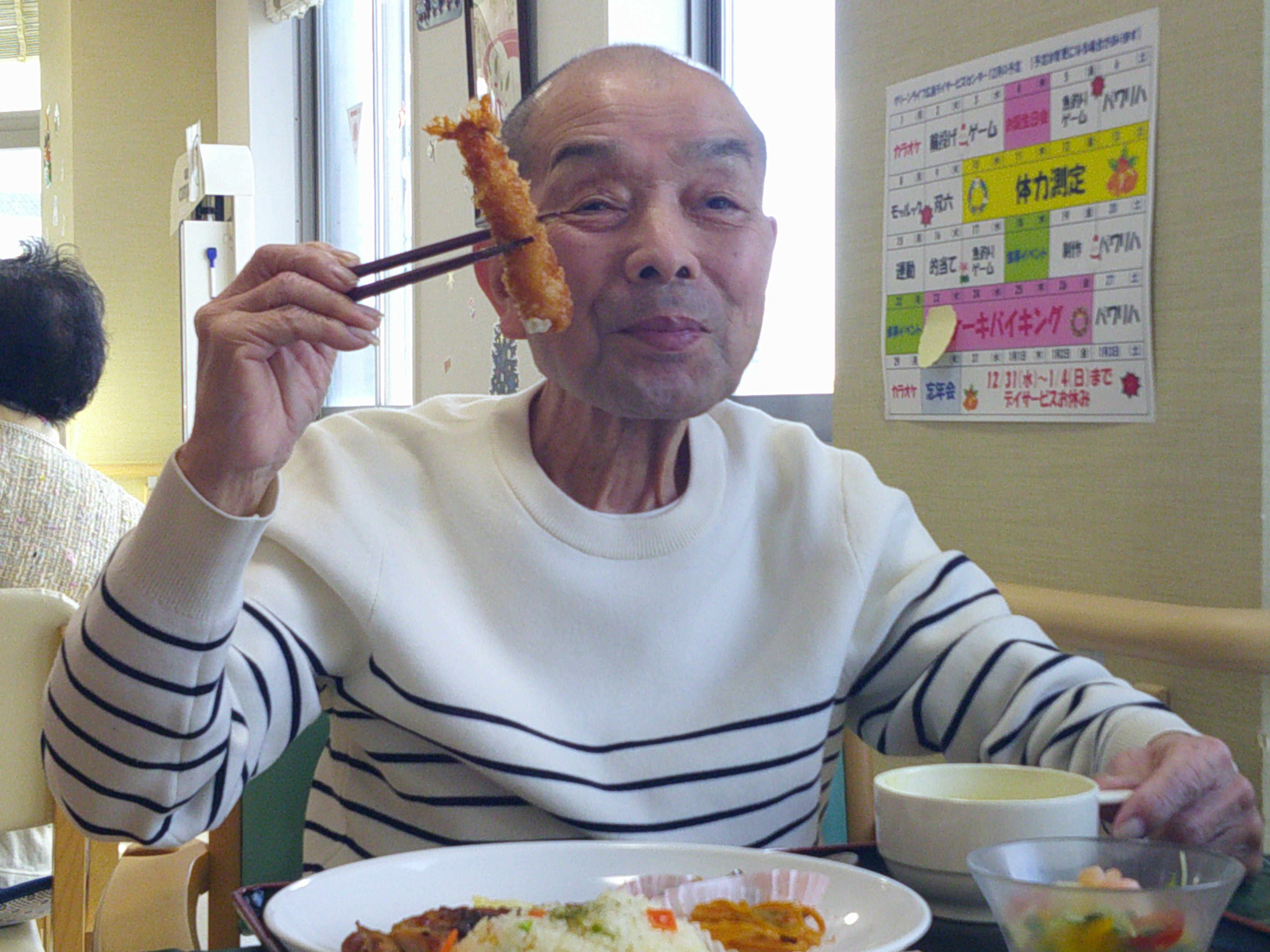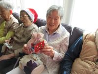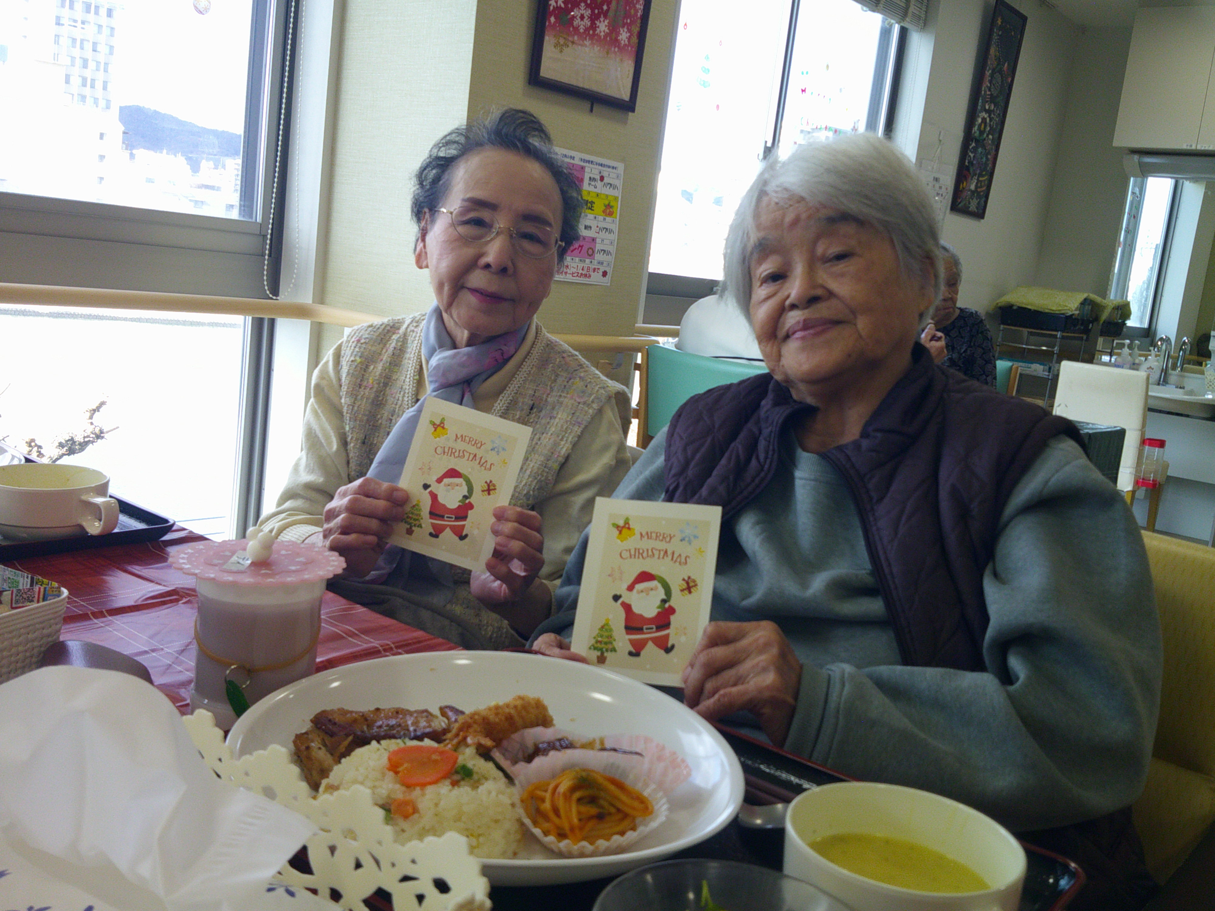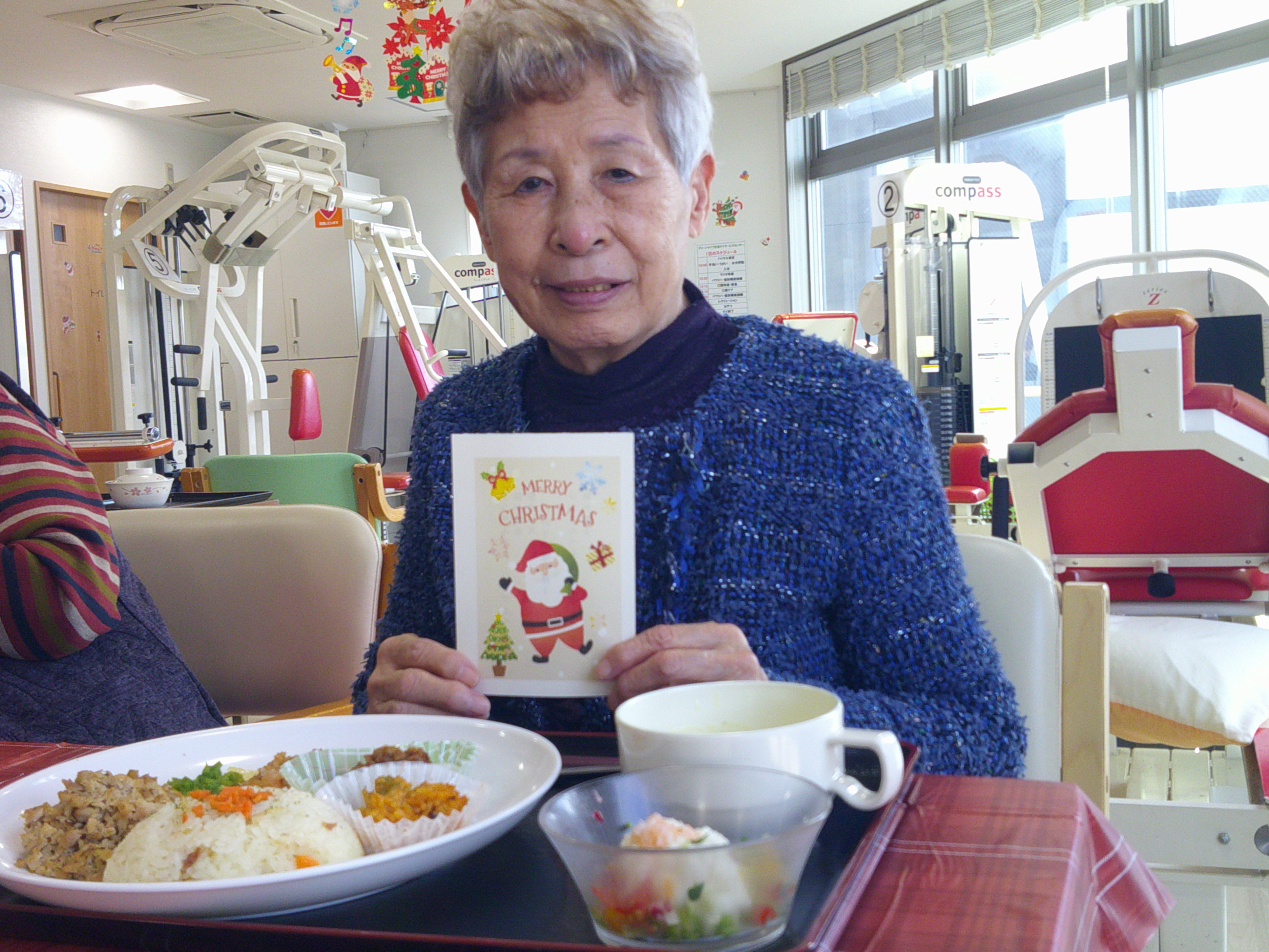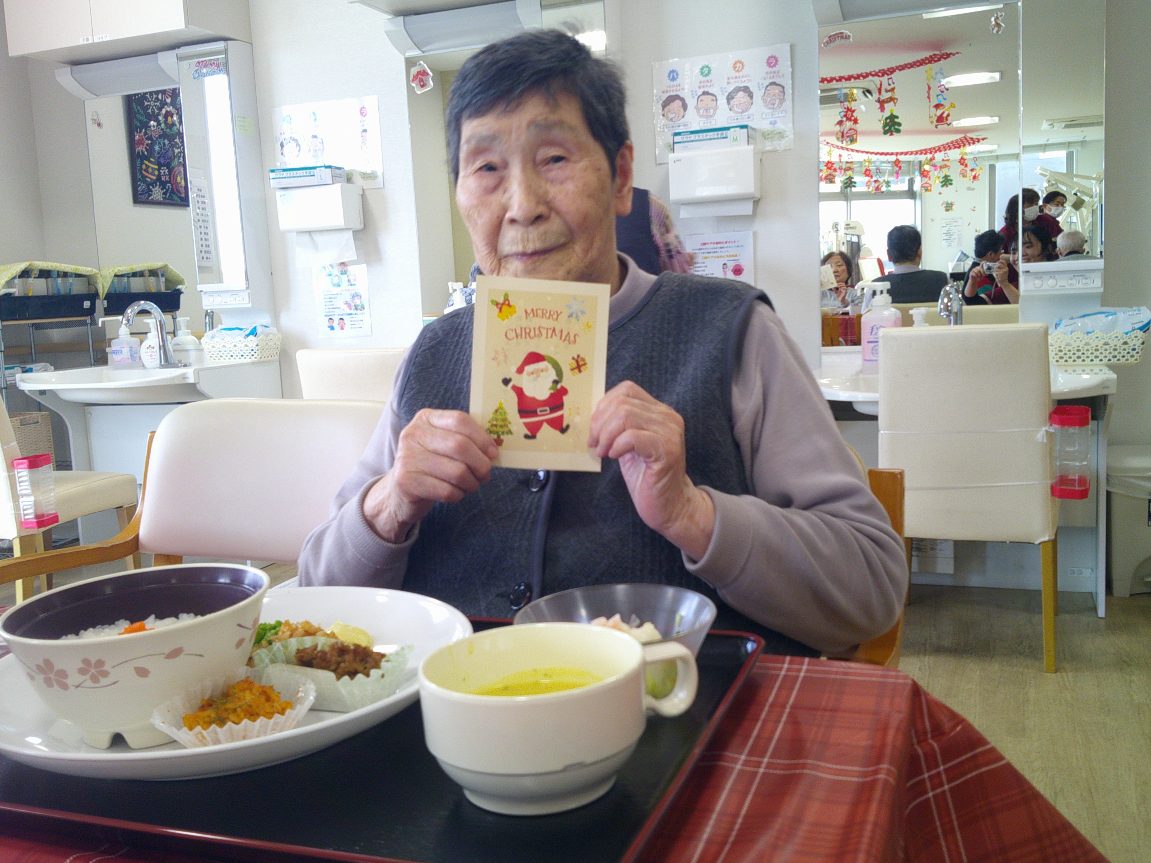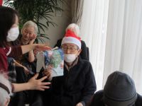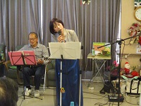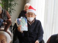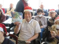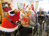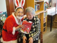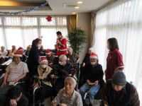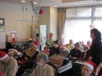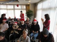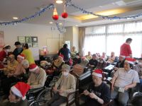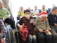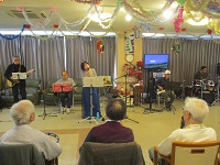 今日は、皆様楽しみにしていた「ブルースター」の方々が来てくれました。まず、「ひまわり娘」から始まりました。続いて、瀬戸の花嫁、愛して愛して愛しちゃったのよ、ふたり酒・・と続きます。もうすぐクリスマスということで「赤鼻のトナカイ」「サンタが街にやってくる」も演奏して頂き、この曲は、スタッフがダンスを踊りました。利用者様もマイクを持ち、前に出て歌います。皆様お上手で最後には、大きな拍手がおこります。最後の「好きになった人」は、これまで、静かにしていて方が前に出てマイクをもち歌います。皆様、お上手です。ダンスあり鈴やタンバリンも鳴らしてのとても楽しい慰問となりました(*^▽^*)