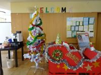 1階に恒例のクリスマスツリーとそりを飾りつけしました。