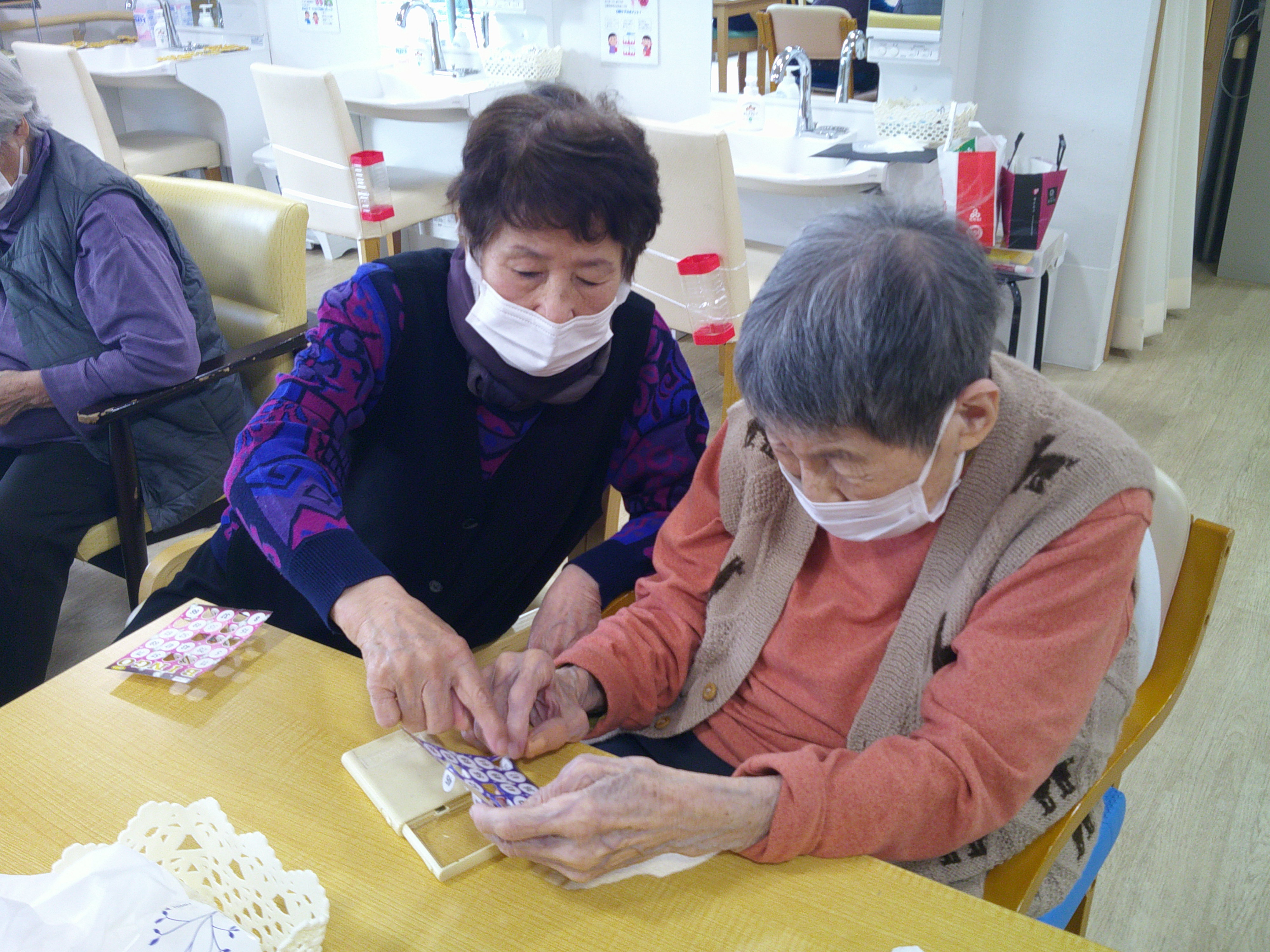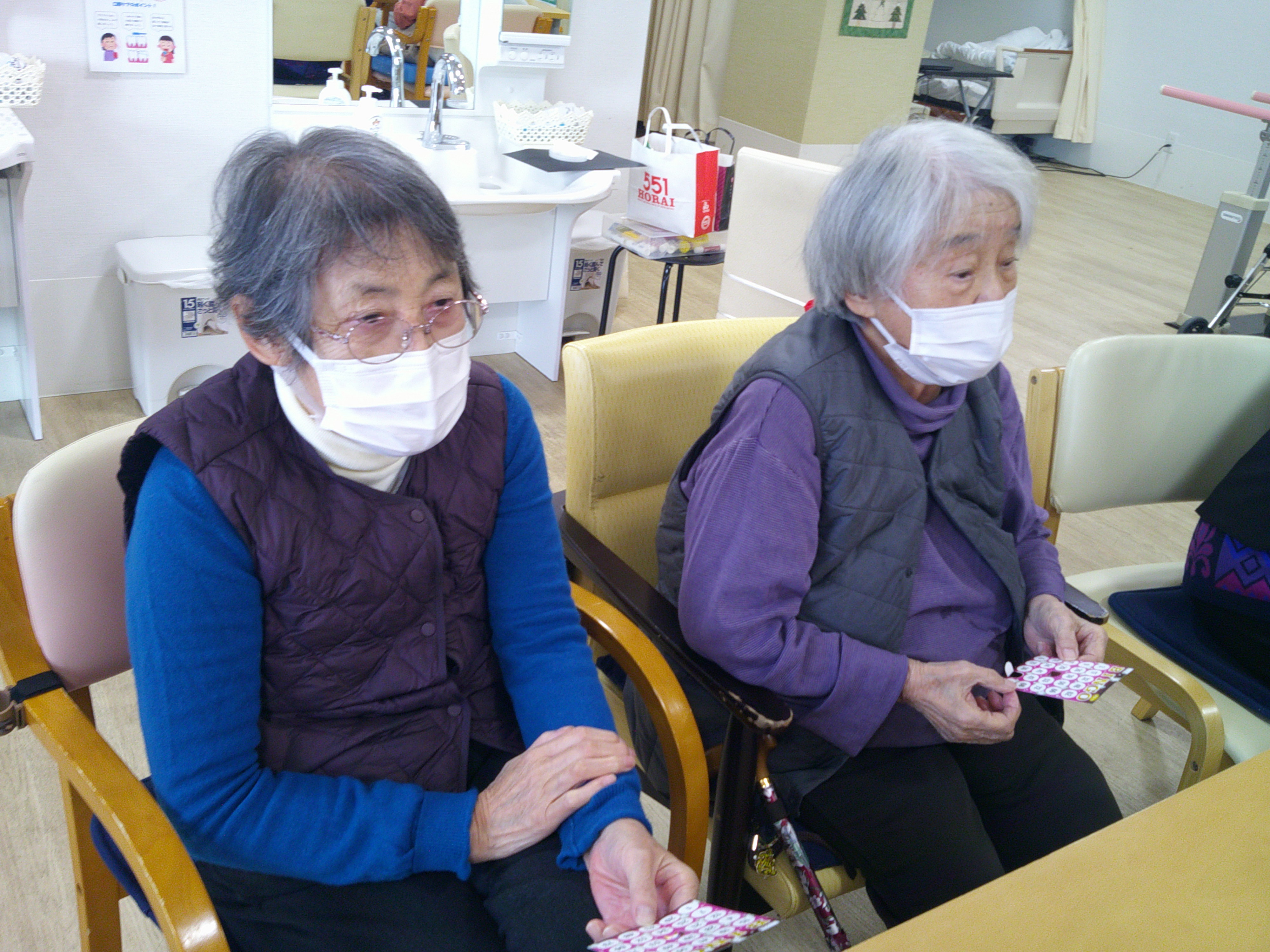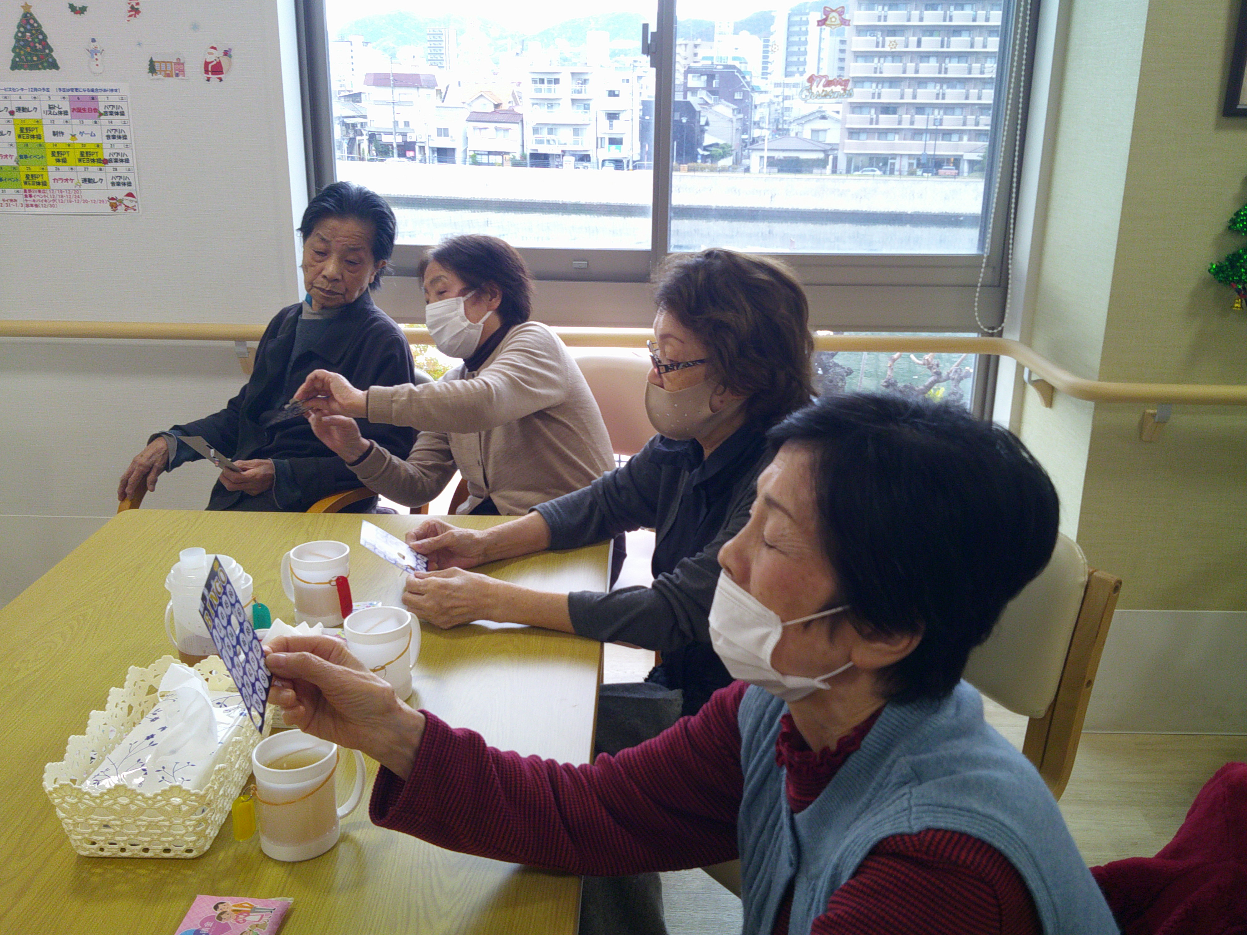 今日は、久しぶりに「かるたとり」をしました。上毛かるたから始めました。上毛かるたは、皆様良く知っていて早い事、早い事・・「浅間のいたずら鬼の押出」「伊香保温泉日本の名湯」「鶴舞うかたちの群馬県」「さんばせきとともに名高い冬桜」等々。お孫さんがしていて覚えた方、昔、されていた方、皆様それぞれですが、楽しそうにされていました。また、しましょうね(*^^)v