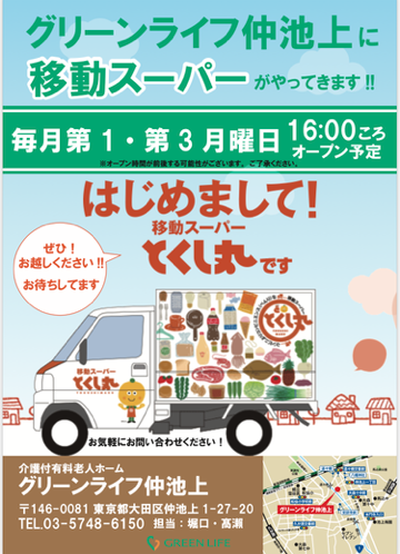 毎月第1・3月曜日の16:00~は施設前に移動スーパー🚗の「とくし丸」が来てくれています!