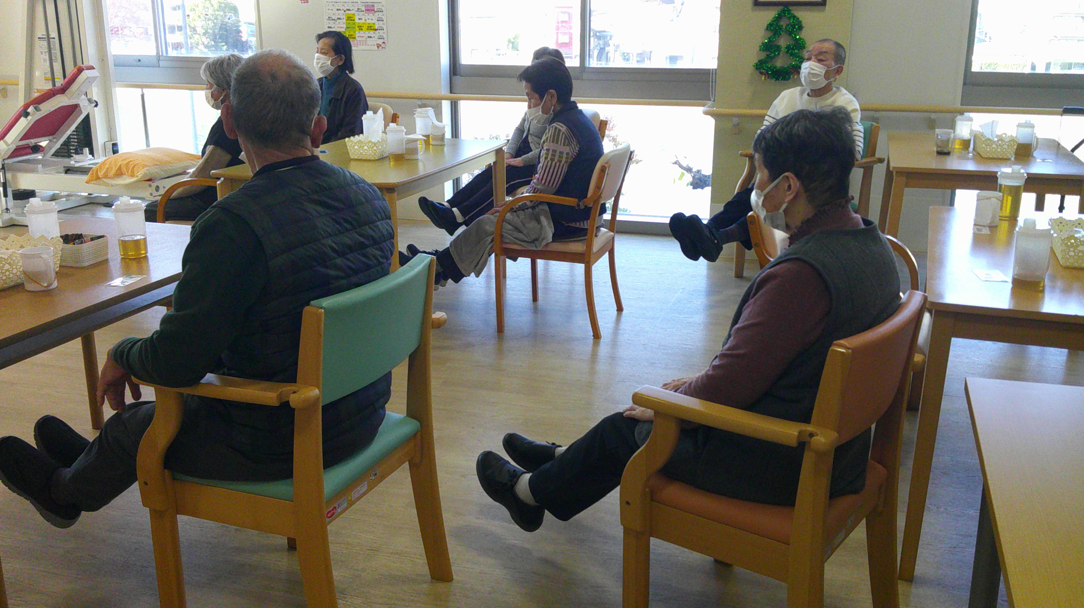 先生の進行とテレビに合わせて、入居者様スタッフ一同で