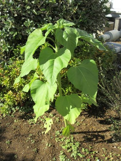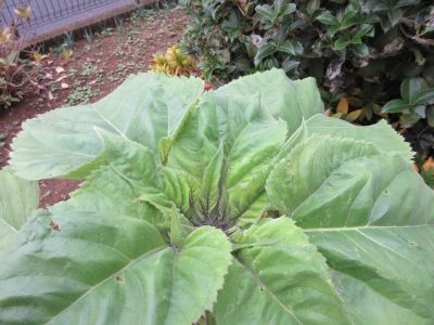 施設の庭に背丈が1メートル以上ある巨大ひまわり