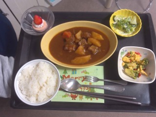 こんにちは、シーハーツ柏です。 今日はクリスマスということで、素敵なランチを召し上がっていただいています。 厨房さんが1皿1皿丁寧に作ってくださったデミグラスソースのオムライスと、ローストビーフにサラダと彩りのよいゼリーもついた豪華ランチでした。「おいしいですよ。」と、次々にお口にご飯を運ぶ姿が印象的でした。 いつも美味しいお食事をありがとうございます。