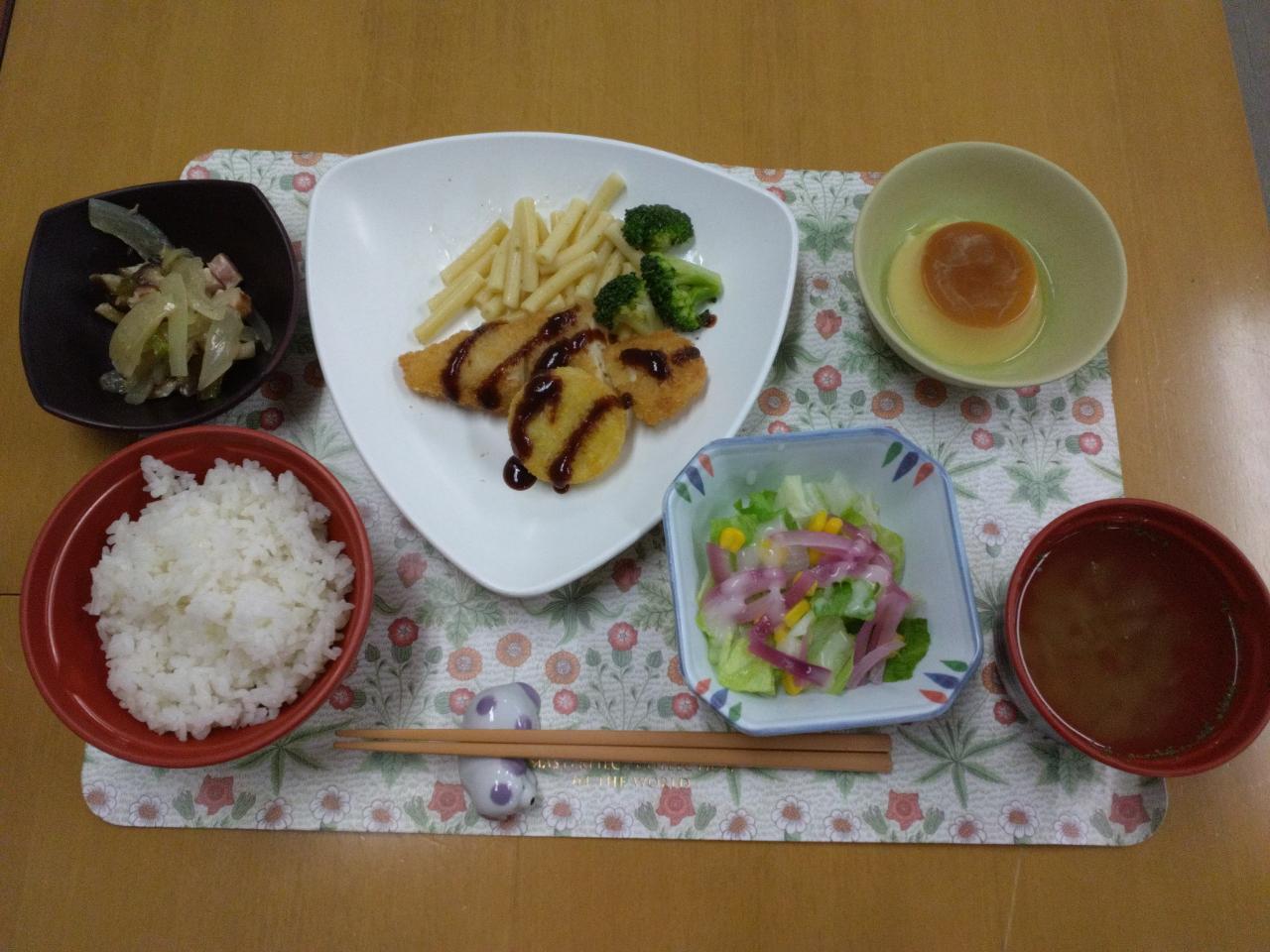 献立のメニューは、豚肉の玉葱ソースとほうれん草とツナの炒め物、マセドアンサラダです。