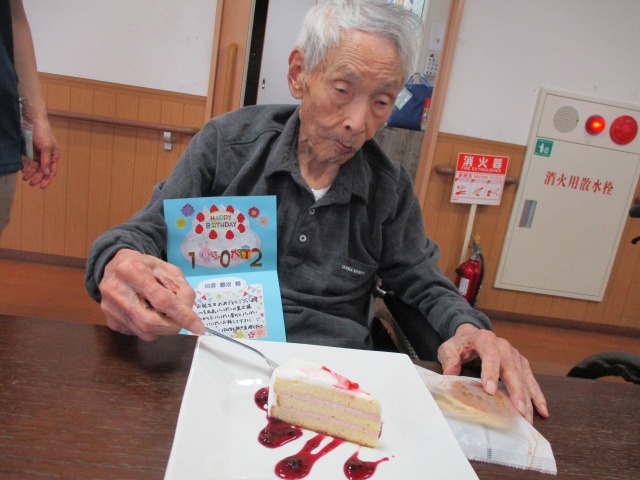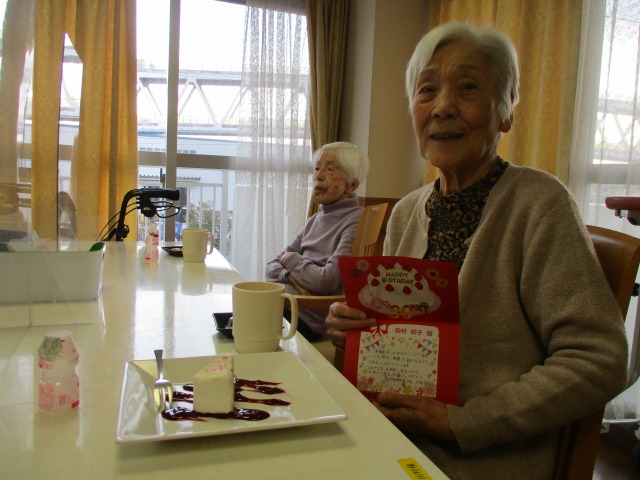 本日11/22はなんと‼お誕生日のご利用者様が2名いらっしゃいます(^o^)/男性のご利用者様はなんと102歳になられます‼ご家族様より102歳を祝してメッセージ入りの三笠饅頭が届きました(*^-^*)もうお一方もご家族様が面会に来て下さり、おやつの時間はスタッフでもお祝いさせていただきました🎂本当におめでとうございます‼これからもお元気でいてください(*^▽^*)