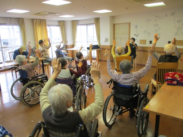 今日は月に一度の【ハッピー体操】の日です(^o^)/今日もたくさんのご利用者様が参加してくださいました‼寒くなってきたので、体が縮こまってしまいがち💦今日の体操は体を大きく曲げ伸ばし、手先、足先までしっかりと動かすものが多くありました(*^-^*)しっかりと動かすと体が熱くなってくるのを実感できます‼音楽に合わせて皆様、とっても楽しく体操ができました(*^▽^*)
