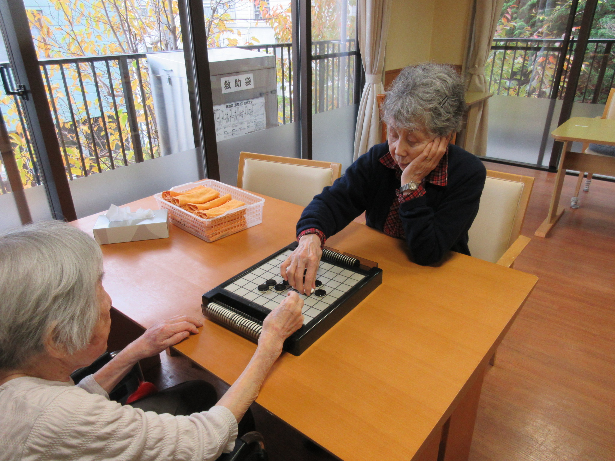 今日のお写真はオセロゲームしているときの写真と、図書コーナーで本を選んでいる写真です。