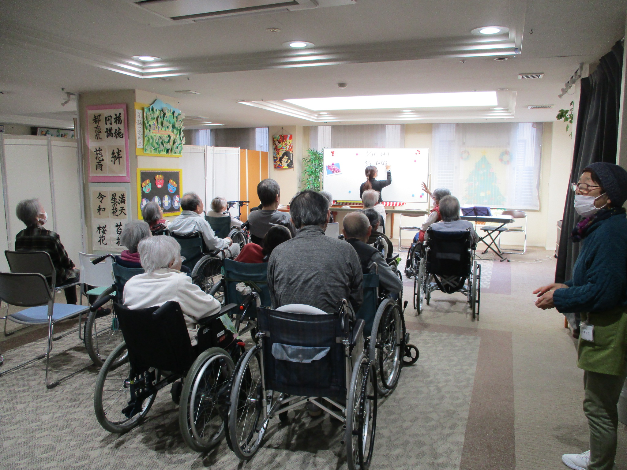 また、テレビのプロジェクターや紙をご入居者様にお配りされ、体操のやり方や実際に体操をしている職員の写真が掲載されております、とても見やすいものとなっていました(≧▽≦)