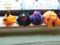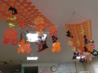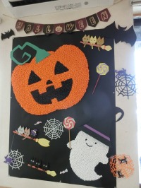 ハッピーハロウィン・・・・・・10月のイベントと言えばハロウィンですね。大きなオレンジ色のカボチャのお化けは、お花紙を一つ一つ丸めて表現しました。窓際にもわくわくするような毛糸で作ったお化け達がいます。天井の飾りつけも素敵ですね。