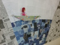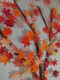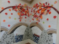 岩国の錦帯橋・・・・・・錦帯橋と紅葉のコラボレーションは圧巻ですね。毎年、紅葉を観に行く方々も多いことでしょう。山口県の観光スポットです。色とりどりの紅葉の葉っぱは折り紙を使って、表現しました。お船には乗っている風景は、折り紙とちぎり絵です。英字新聞も使っています。