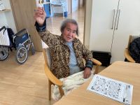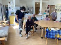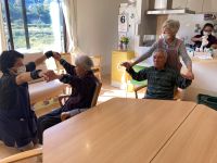 今日も素晴らしい秋晴れ。全員で外気浴した後はフロアーに戻り毎日恒例の百歳体操です。立ったり座ったり足踏みしたり…。