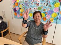 脚や手の運動の際には重りを付けて筋力アップです。目指せ、元気な百歳!