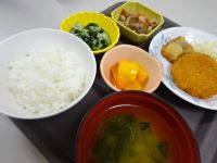 本日の昼食は海老カツ、酢の物、煮豆でした。