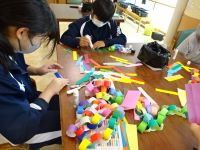 また、入居者様と一緒に折り紙で色わっかを作成してもらいました。
