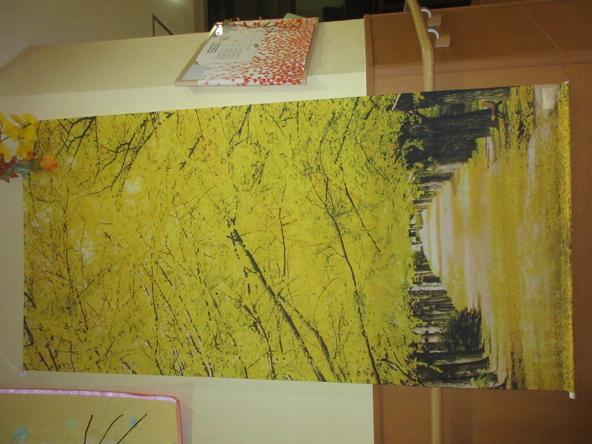 施設内装飾を少し秋らしくするために、秋っぽいタペストリーを購入しました