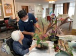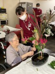 こんにちは、シーハーツ柏です。 月に一度の生け花です。 今日のお花のセレクトは、かわいいピンクのガーベラやカスミ草がありました。 ケアスタッフが中心になり、スタッフ総出で、入居者様のサポートをします。「いいですね。こういう魅せ方もありますよ。」「手直しを○○さんにしてもらいたいの。」と、入居者様から声がかかります。今日は早朝からケアスタッフのサポートに入った小林施設長も大忙しでした。忙しいなか入居者様をしっかりサポート。 頼もしいです。 茎の細いカスミ草を剣山に差すのが、至難の業でしたが、作品が完成すると、笑みがこぼれます。