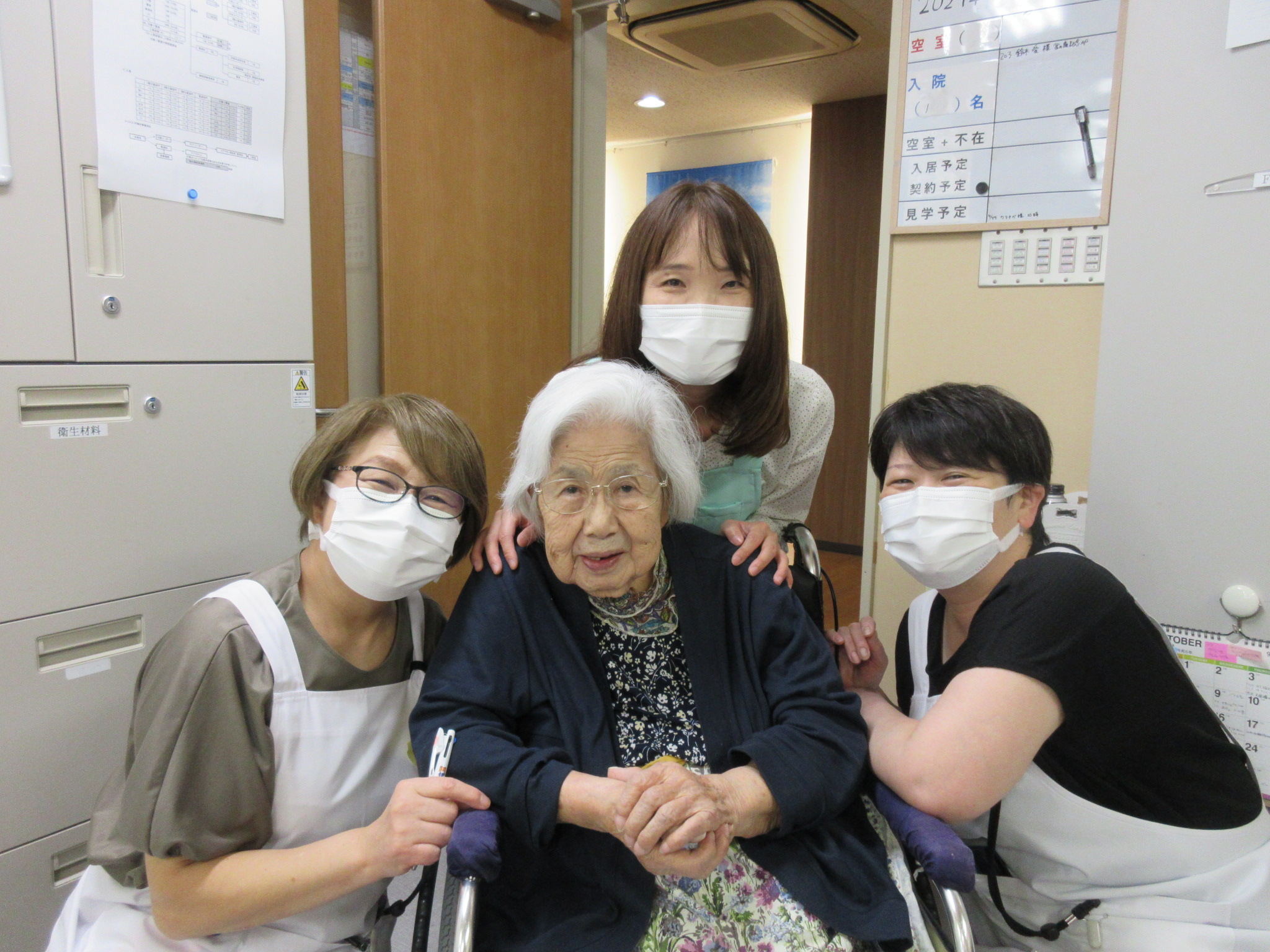 先週入院された入居者さんが本日退院されたので記念に職員と写真を撮りました