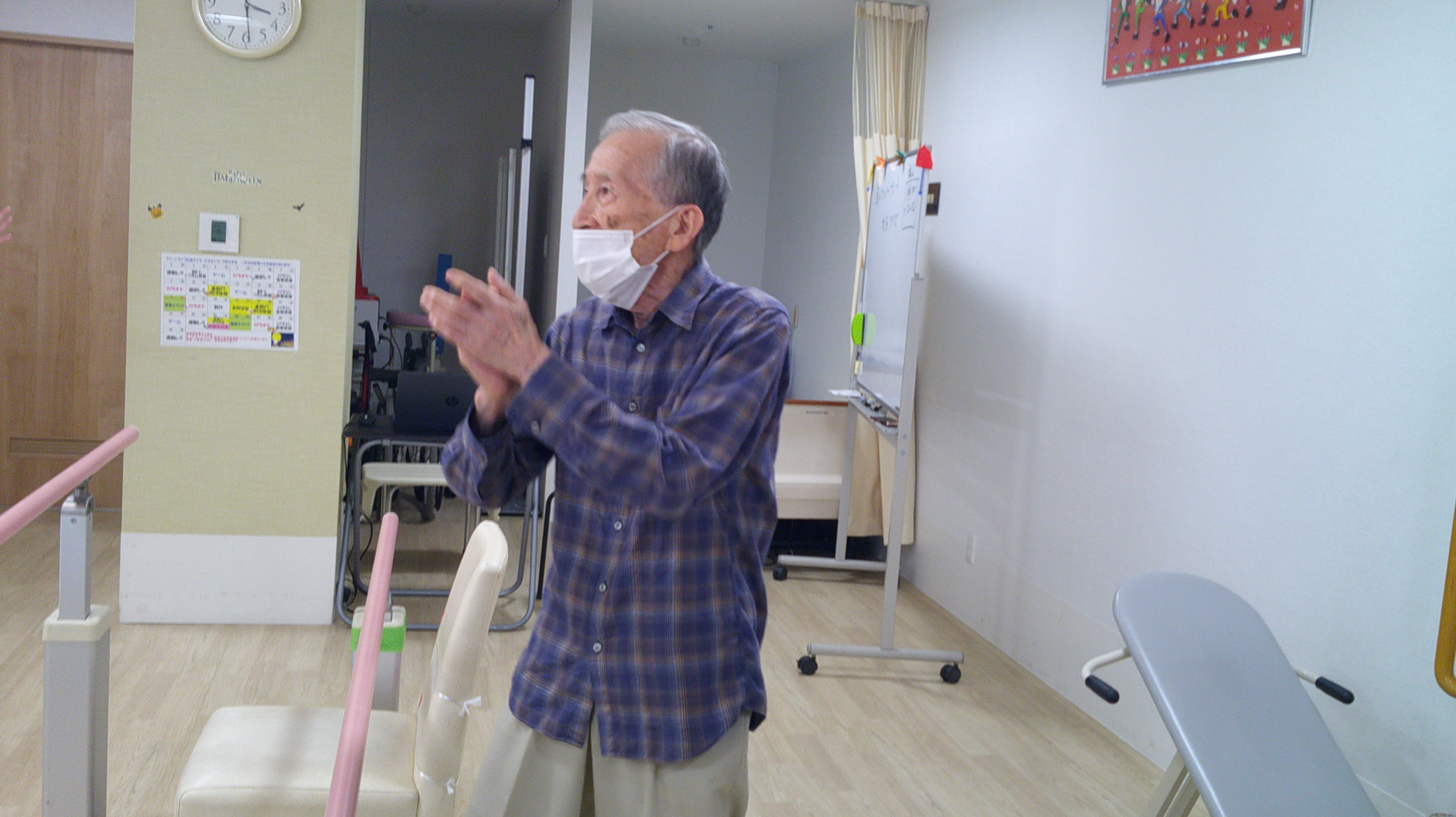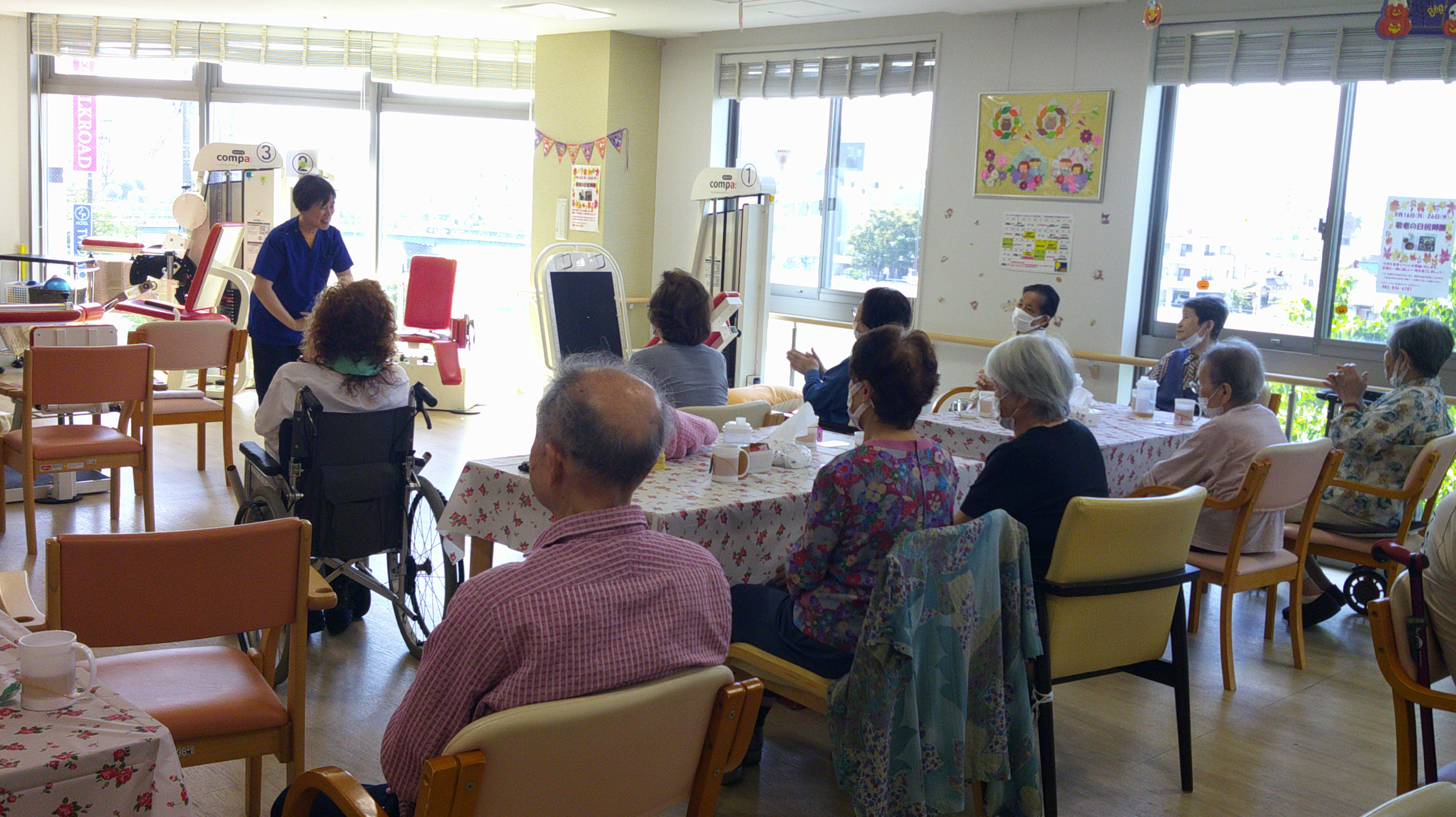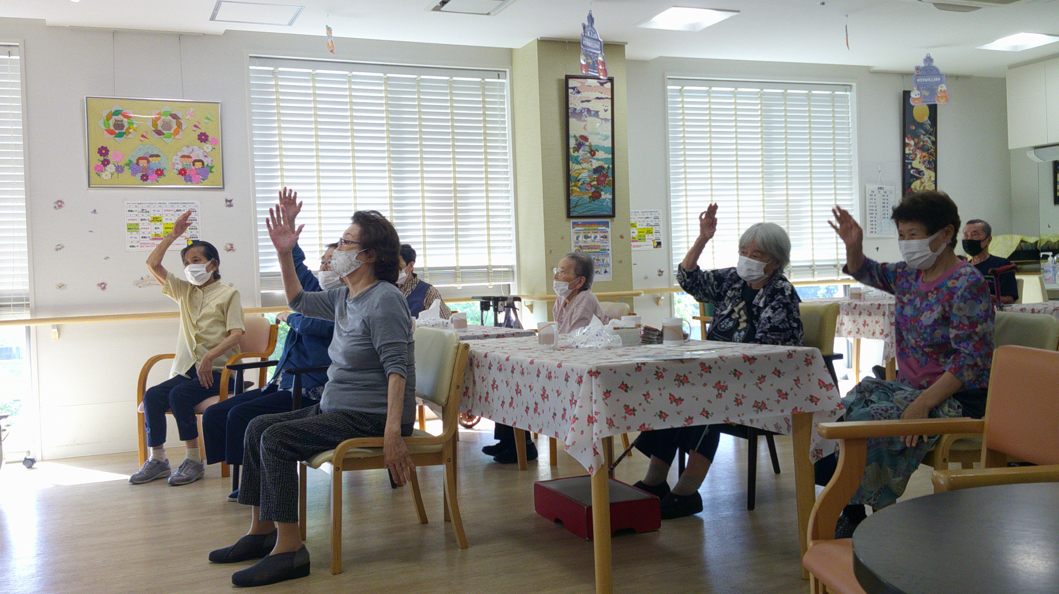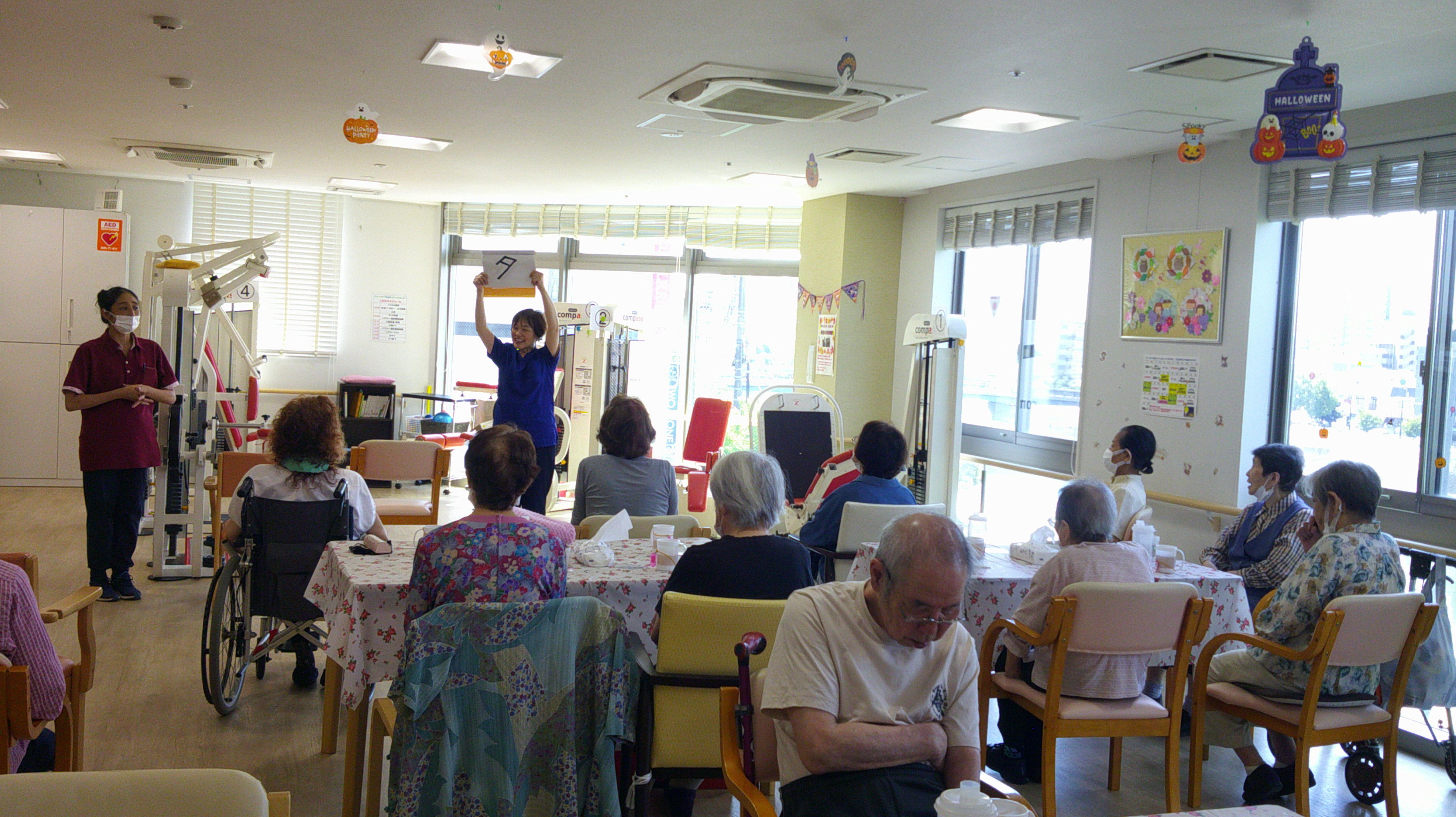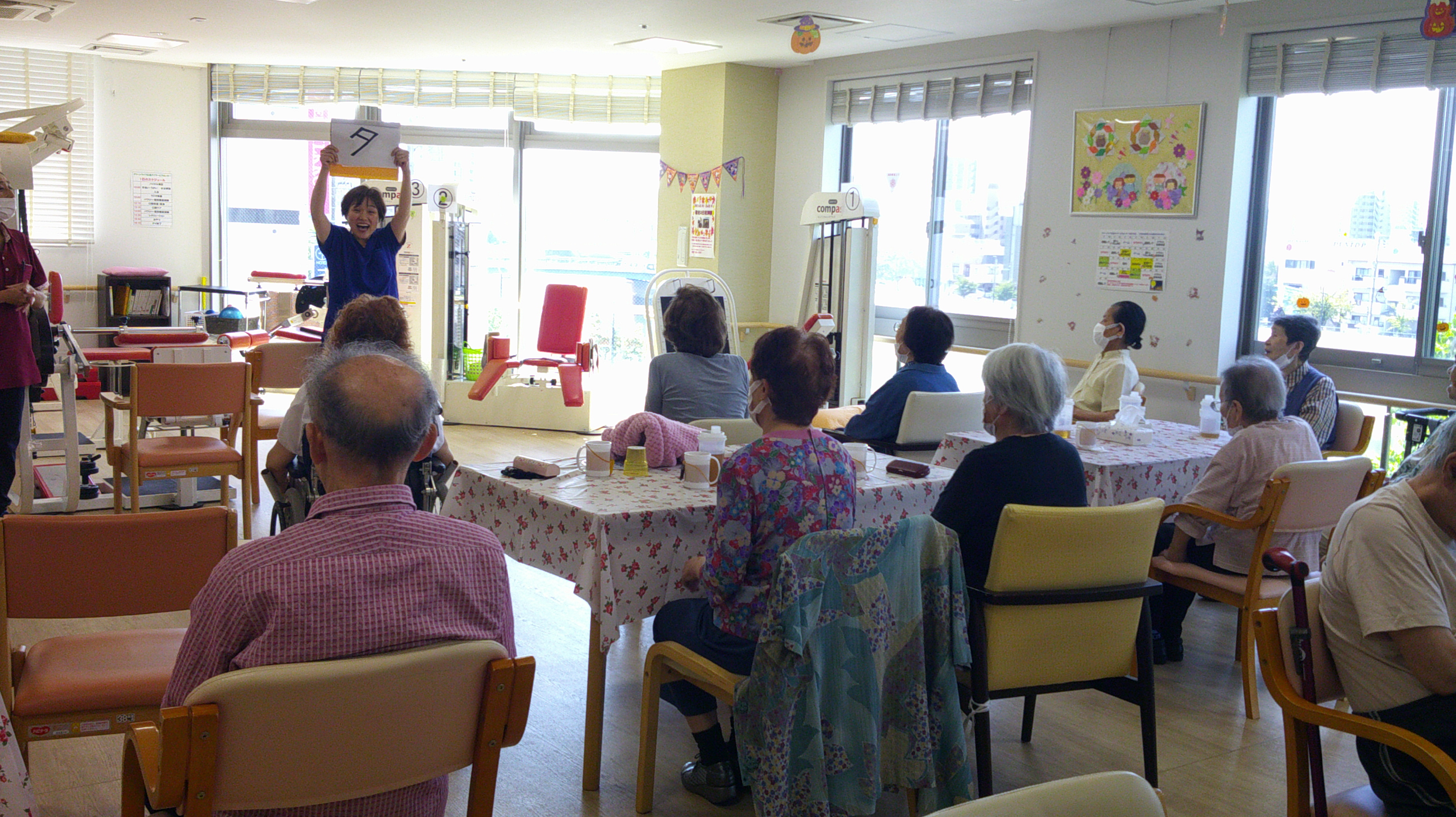 本日は運動レクで風船を使ったゴルフゲームをしました。かごに30点、40点、50点、100点と書かれた紙を貼り、職員が作った手作りのラケットで5個の風船を飛ばしかごの中に入れ何点とれるか競いました。最初はなかなかかごの中に風船が入らず皆さん苦戦していましたが、職員が「風船の下の方を打つと高く飛びますよ。」とこつを教えると風船が高く飛びがごの中に入るようになりました。一番点数をとられた方は恥ずかしそうにしながらも喜んでおられました(^_-)-☆