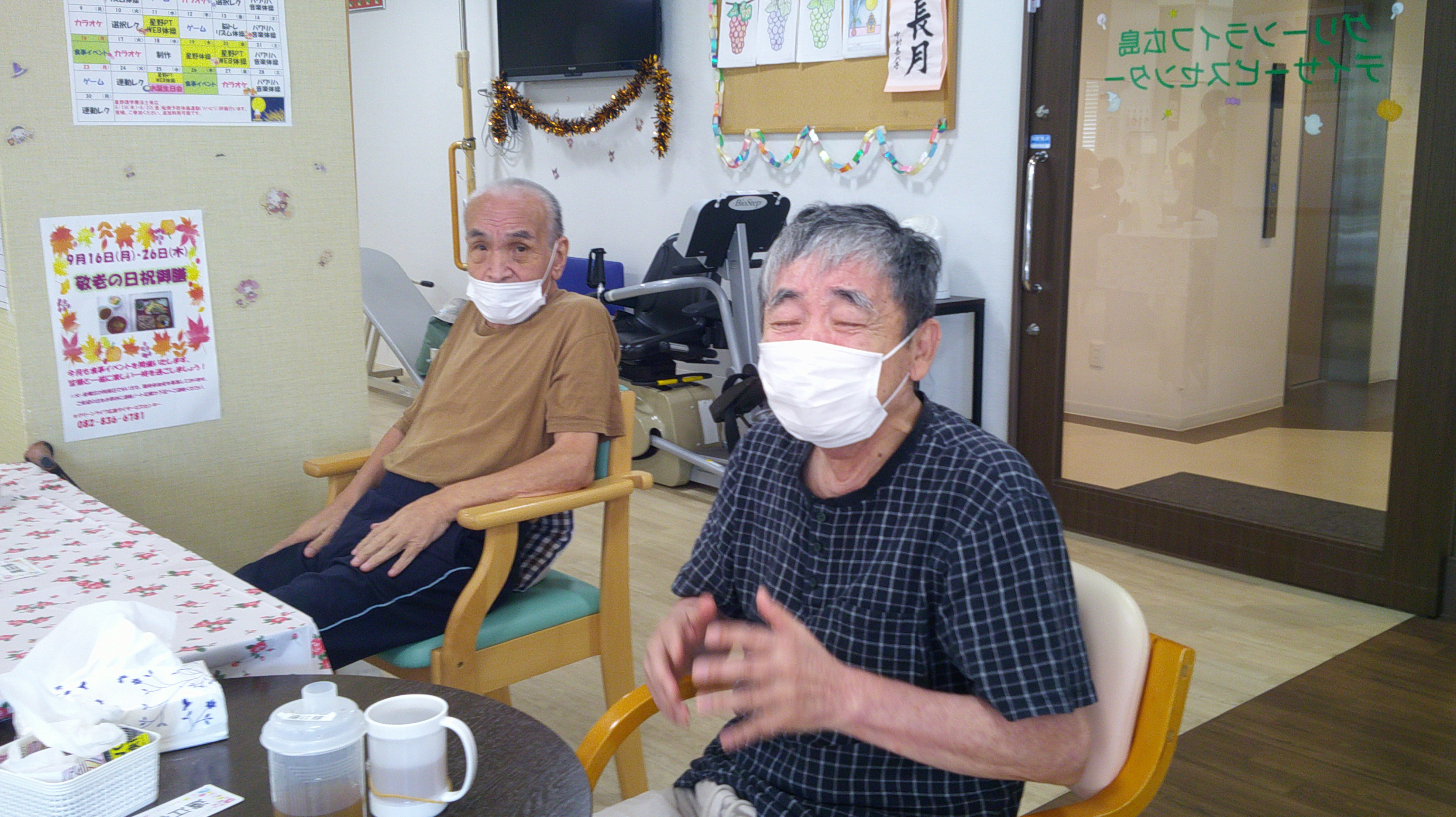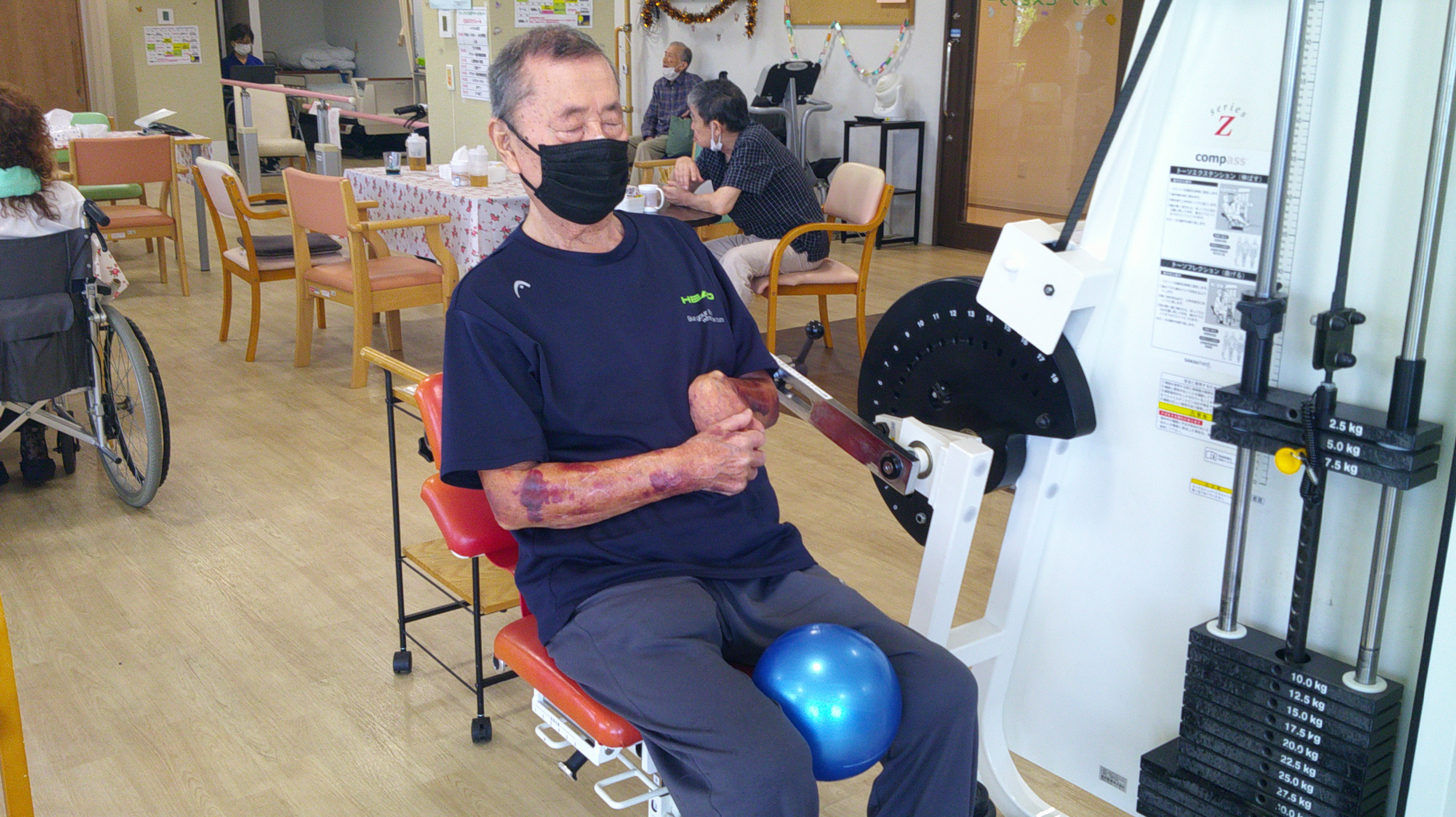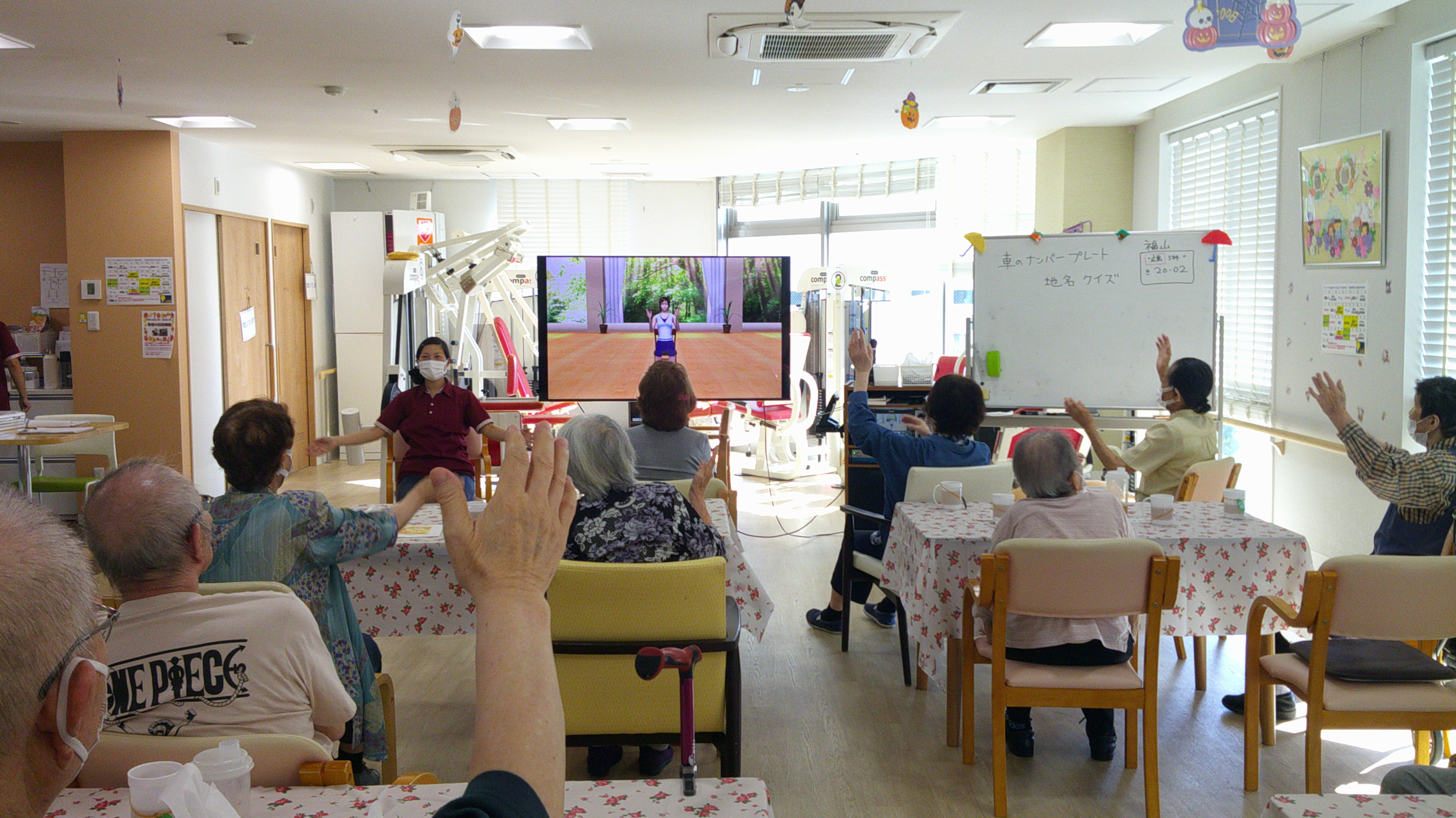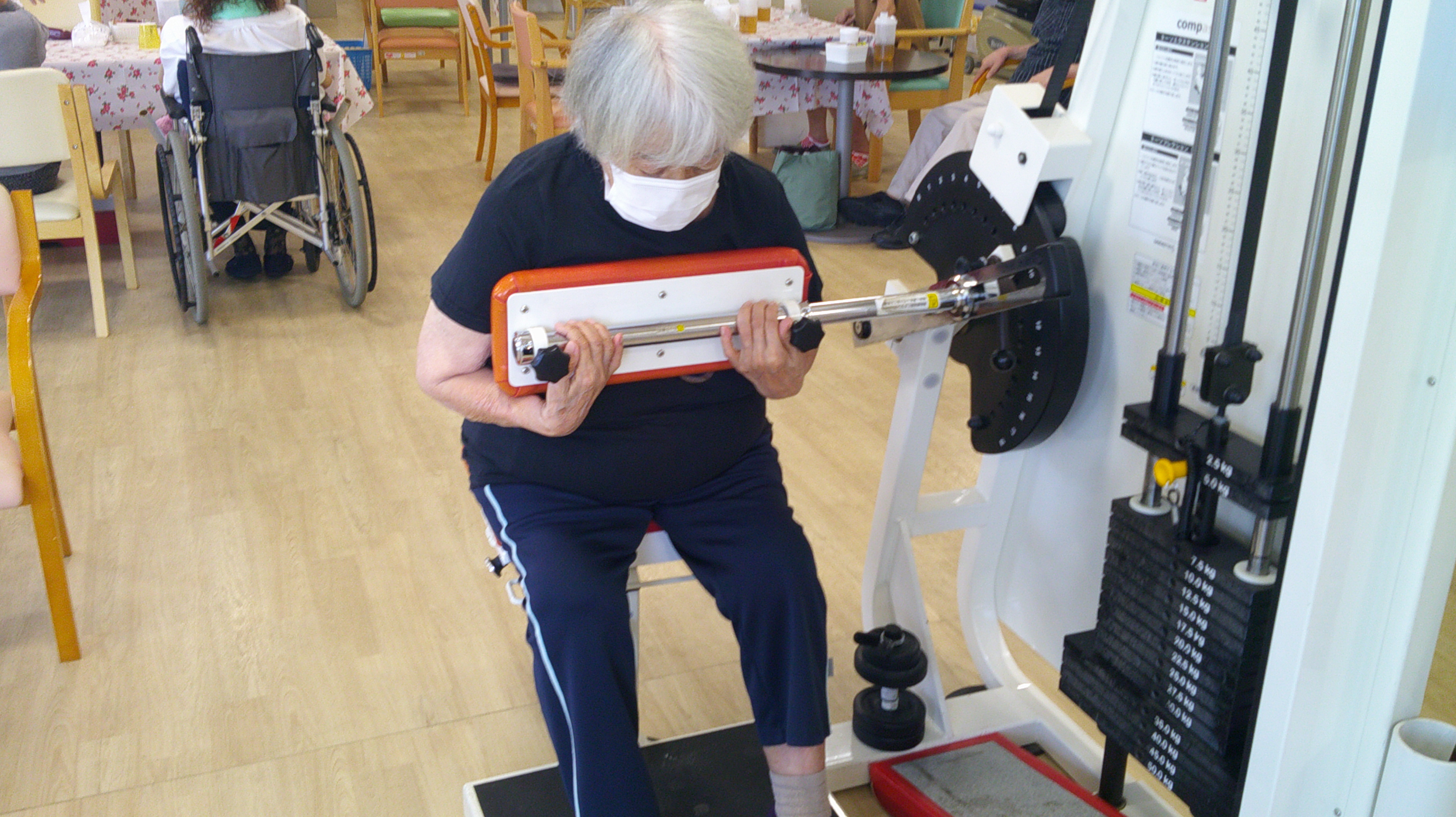 本日は運動レクで風船を使ったゴルフゲームをしました。かごに30点、40点、50点、100点と書かれた紙を貼り、職員が作った手作りのラケットで5個の風船を飛ばしかごの中に入れ何点とれるか競いました。最初はなかなかかごの中に風船が入らず皆さん苦戦していましたが、職員が「風船の下の方を打つと高く飛びますよ。」とこつを教えると風船が高く飛びがごの中に入るようになりました。一番点数をとられた方は恥ずかしそうにしながらも喜んでおられました(^_-)-☆