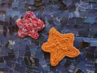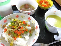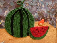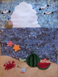 残暑・・・・・・青い海や空の様子をちぎり絵で表現しました。大きな入道雲もとても存在感があります。カモメやカニなどの動物やスイカは毛糸を使って作り上げました。もうすぐ夏も終わりごろですが、まだまだ暑い日が続きますね。