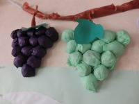 ぶどう・・・・・・秋の味覚と言えば、ぶどうの美味しい季節ですね。紫色の巨峰や緑色のシャインマスカットなど、大きいブドウがツルにぶら下がっている様子をお花紙を丸めて作っています。