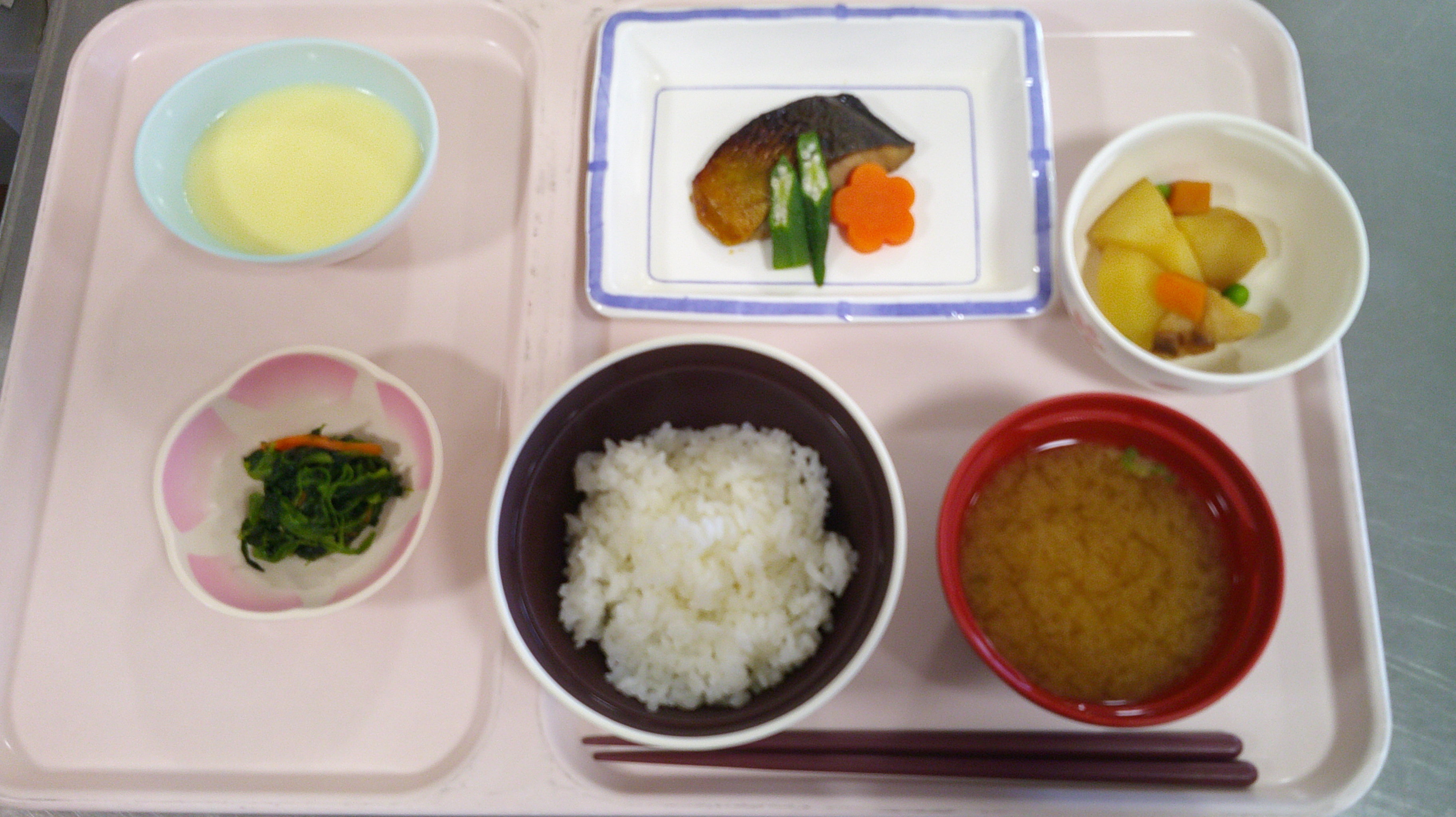 献立のメニューは、豆腐ハンバーグ和風あんかけと白滝とたらこの真砂炒め、青梗菜の海苔和えです。