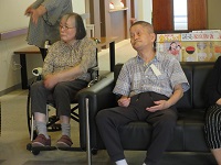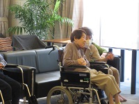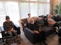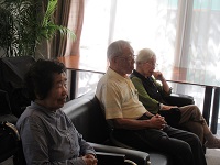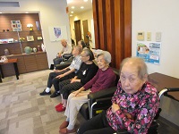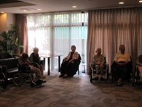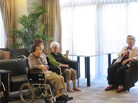 女性入居者様3名で集まって玄関先のベンチに座られて