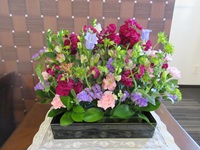 今回はストック、アルストロメリア、スターチスなど紫がメインのアレンジです。