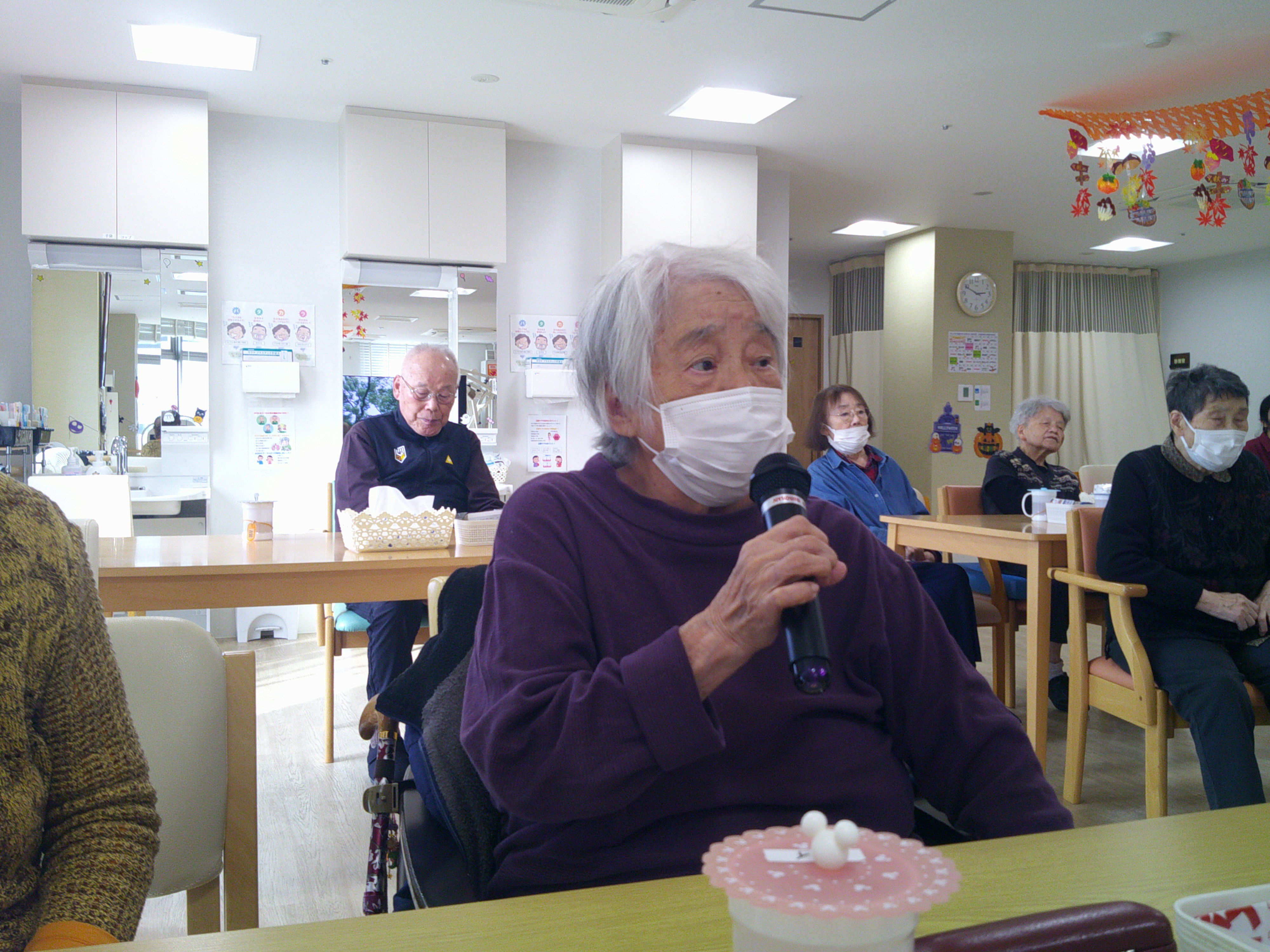 こんにちは、デイサービスです。今日の回想法レクはいろいろな質問をして昔のことを思い出して答えてもらいました(*^-^*)「子どものころ友だちから何と呼ばれていましたか」「よく食べたおやつは何ですか」などです。思い出して皆さんの前で発表することも、他の方の発表を聞くのも楽しいと好評でした。よく食べたおやつはサツマイモと答えてくださった方が多かったです🍠また10月お誕生日会も行いました。全員でバースデーソングを歌って職員からはバースデーカードをプレゼントしておやつにケーキをいただいてお祝いしました(^^♪
